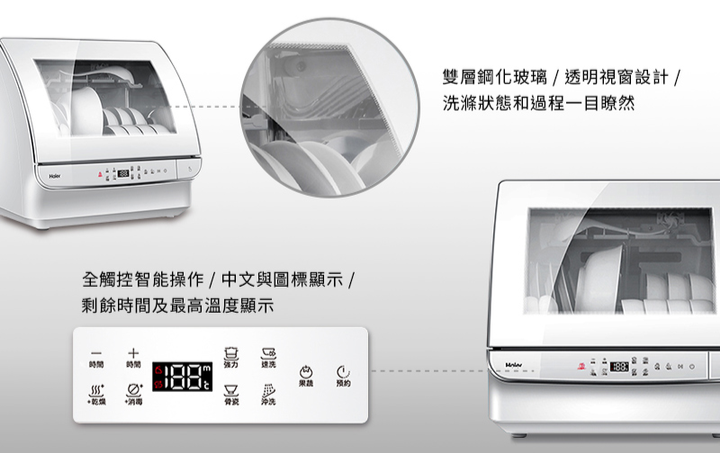 海爾小海貝洗碗機為智能全自動洗滌,節水又省電,擁有多種洗滌模式,輕鬆洗淨更省事,把人工洗碗的時間,省下來留給自己和家人!不需預留嵌入位置,可以自由地擺放在廚房櫥櫃檯面,薄至 37cm 的機身,不佔空間,小廚房也能有洗碗機。