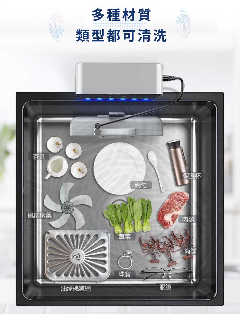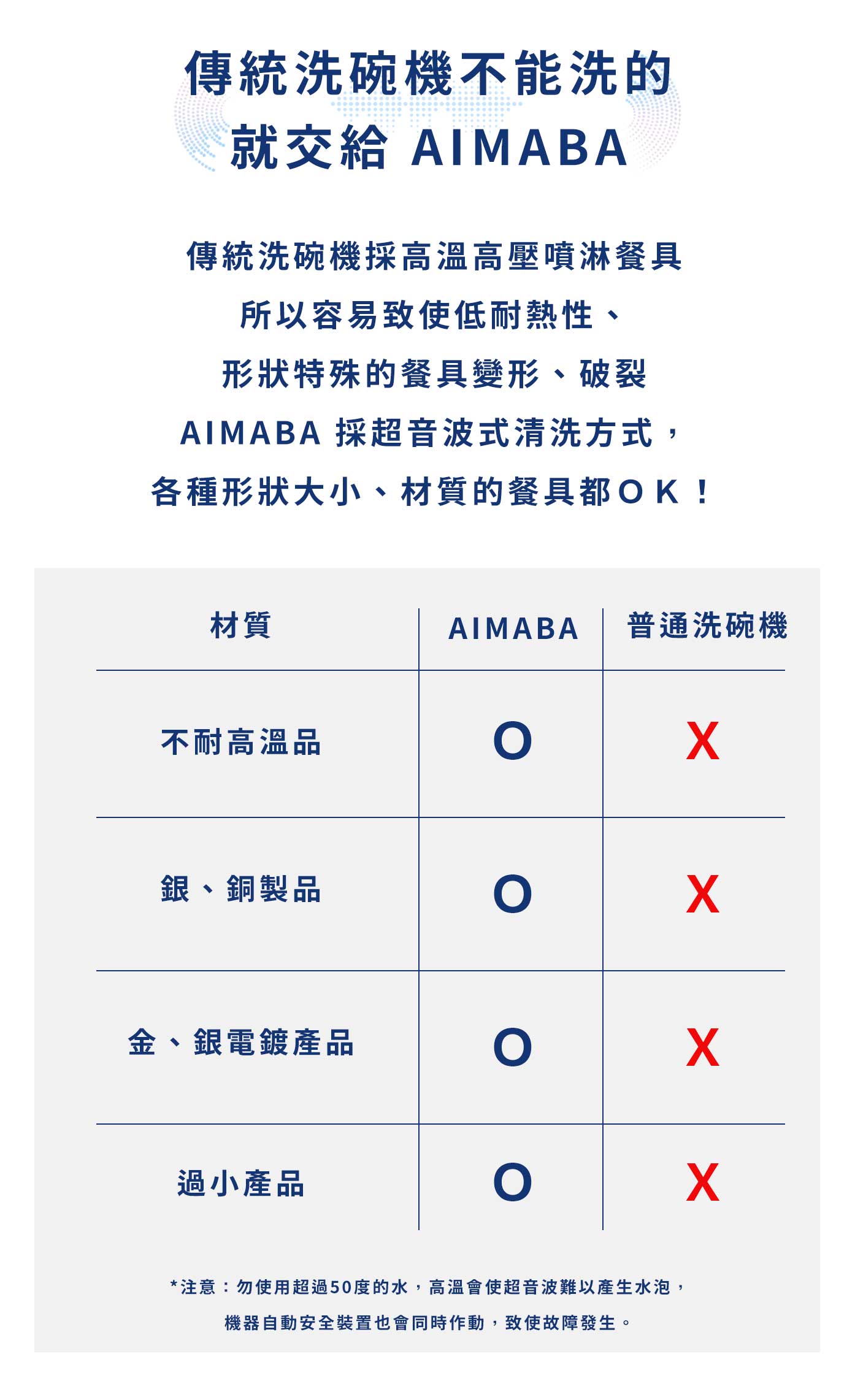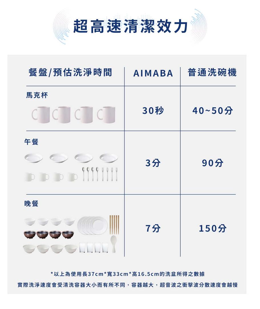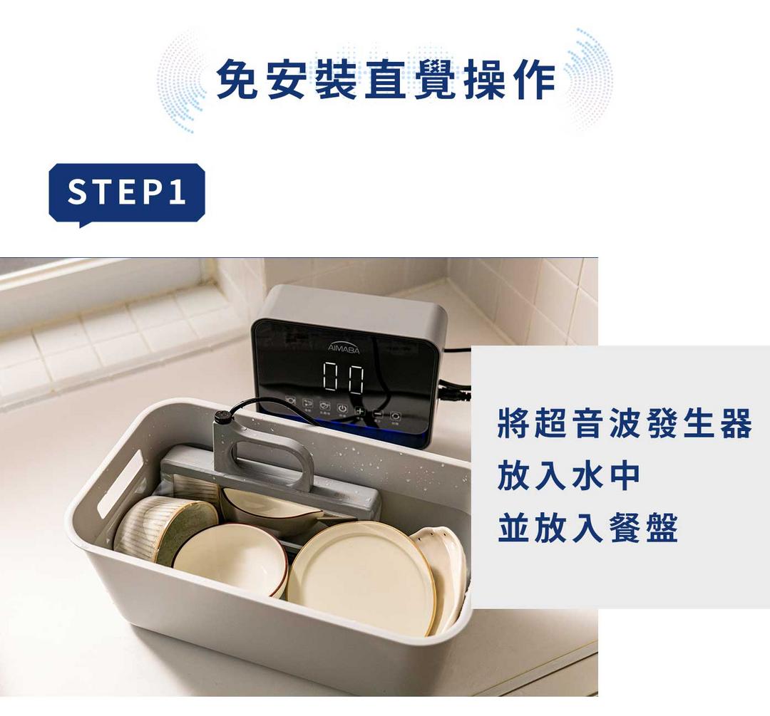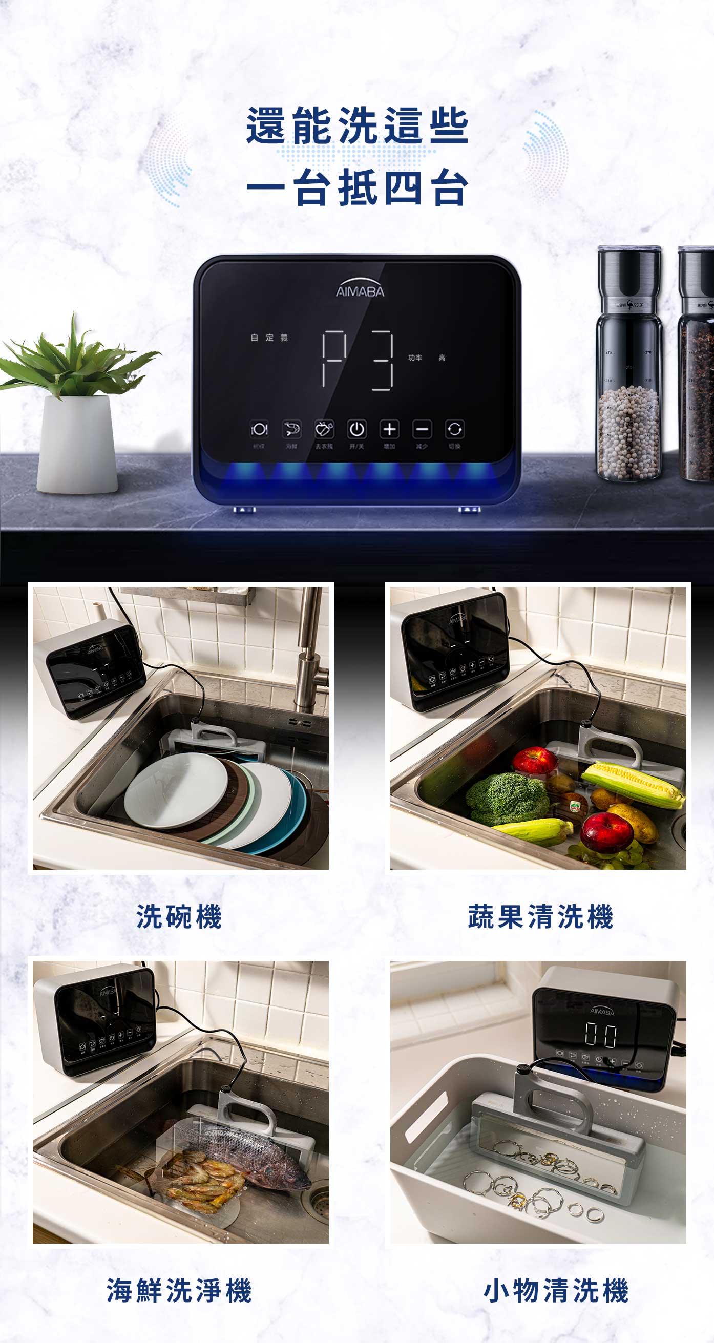碗盤去污、蔬果去農藥、海鮮肉品去雜質、另外塑膠玻璃金屬等等 AIMABA 都能有效清潔。