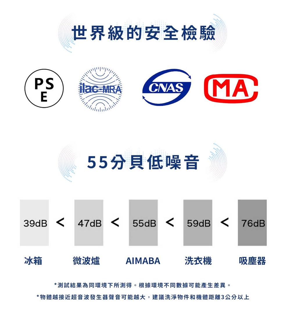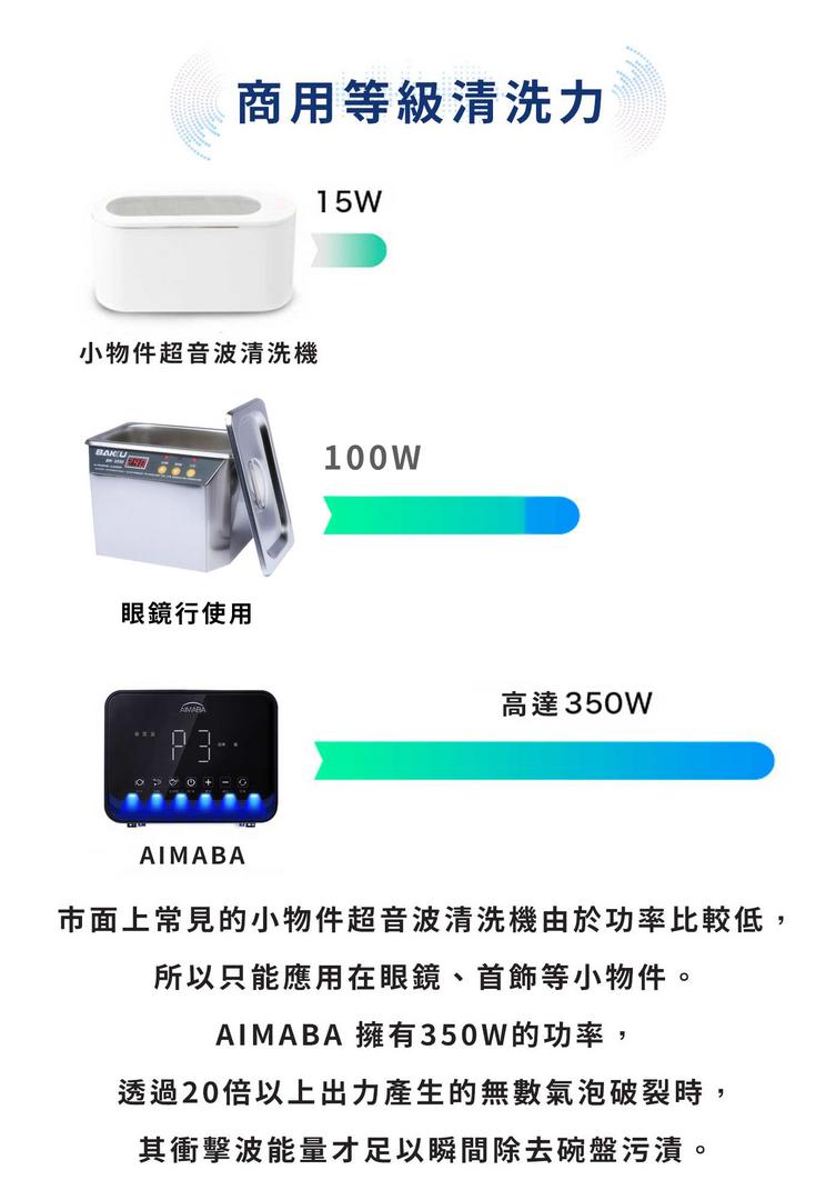 AIMABA 的輸出功率是一般常見超音波清洗器的「20倍」,強力超音波產生的氣泡更多、更能有效載走污漬,洗淨能力遠超其他機器!