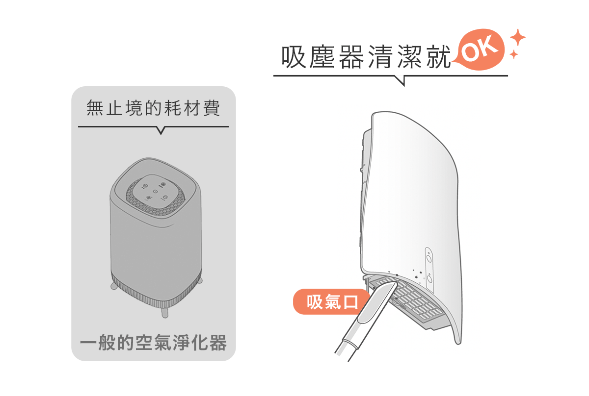 除味君不需要定期更換濾網,省去更換的困擾。只需日常使用吸塵器清潔入風口和出風口,即可輕鬆維護,無需額外耗材或成本。