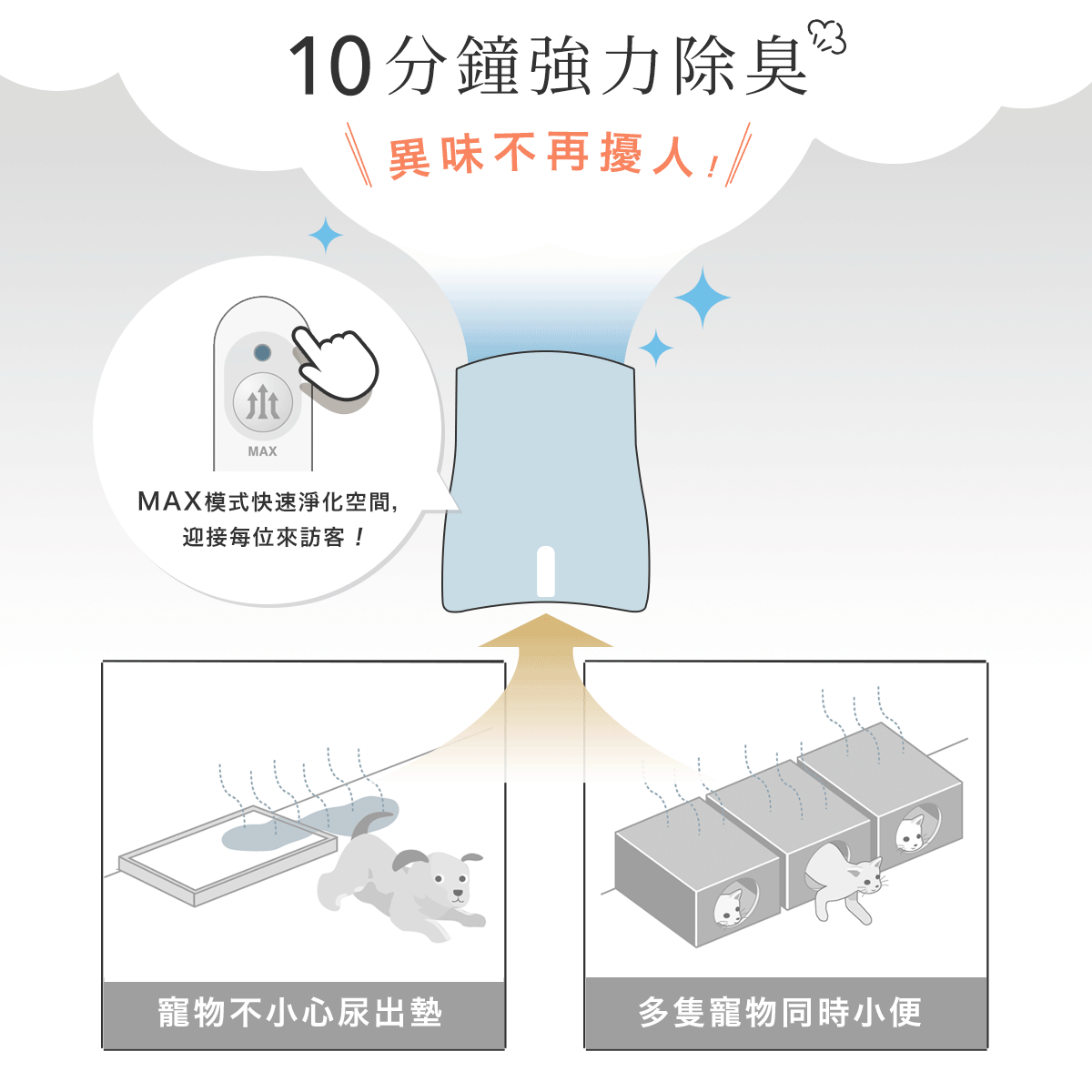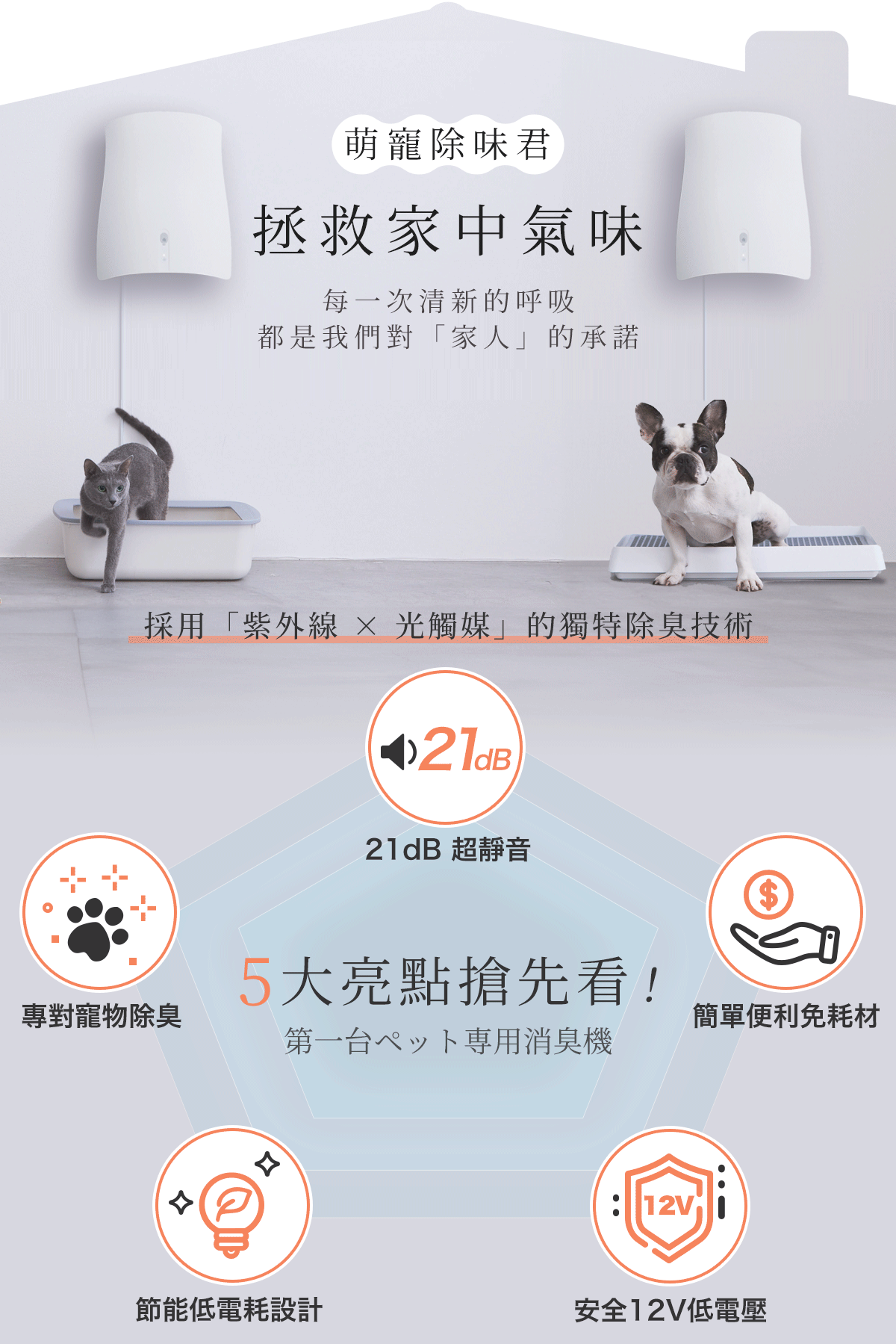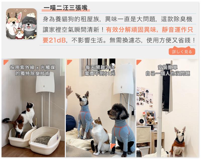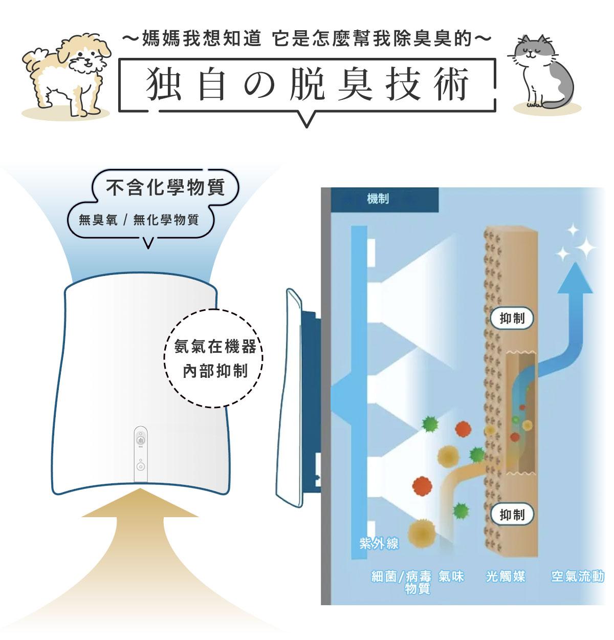 採用「紫外線 × 光觸媒」的獨特除臭技術,分解去除有害物質,不釋放臭氧或化學物質除臭方法即可抑制細菌、病毒和引起的異味,家中不再充滿寵物異味!
