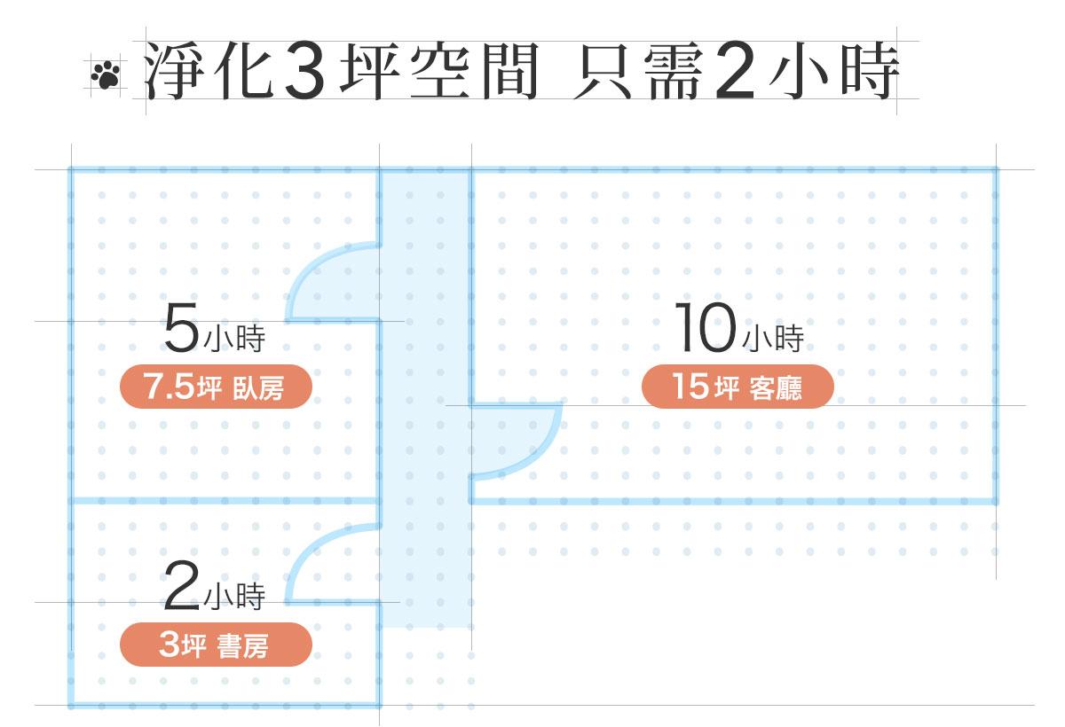以 3 坪( 25 立方公尺)密封空間為例,可在 2 小時有效減少 99% 空氣中細菌/病毒。除了寵物味道以外,日常生活中的異味,如廚餘、體臭等異味分子都有效降低至幾乎聞不到!