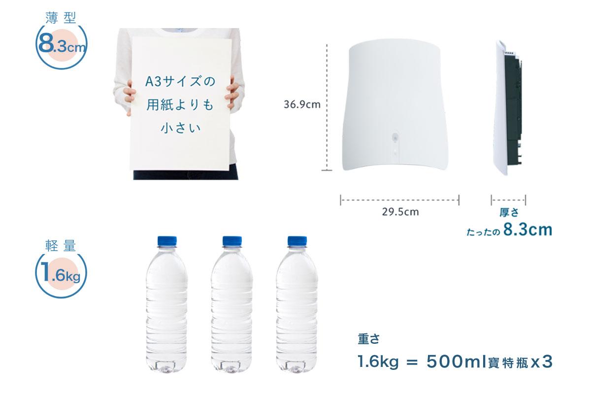 尺寸只有 A3 紙的大小,厚度僅有 8.3 公分,機身輕薄不佔空間,也不會對寵物產生壓迫感, 1.6 公斤輕盈重量可以懸掛於牆面,適用家中的任何空間。
