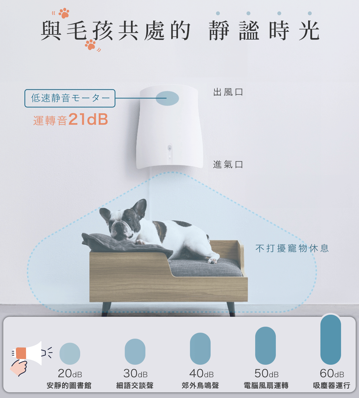 獨特的過濾技術讓機器在運轉時幾乎靜音,在標準模式下,距出風口 1m 處的運作聲音為 21dB ,就連敏感的寵物也不會被打擾。