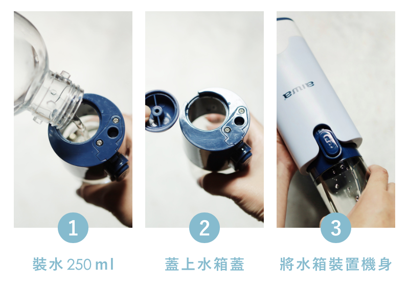 簡單步驟,使用 250ml 可拆卸水箱,蓋上水蓋,即可長時間使用,加水輕而易舉!