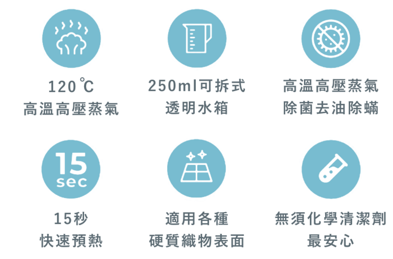 採用 1200W 大功率發熱管設計,只需要 15 秒,即可將水轉化為高溫蒸氣,99% 有效除菌。