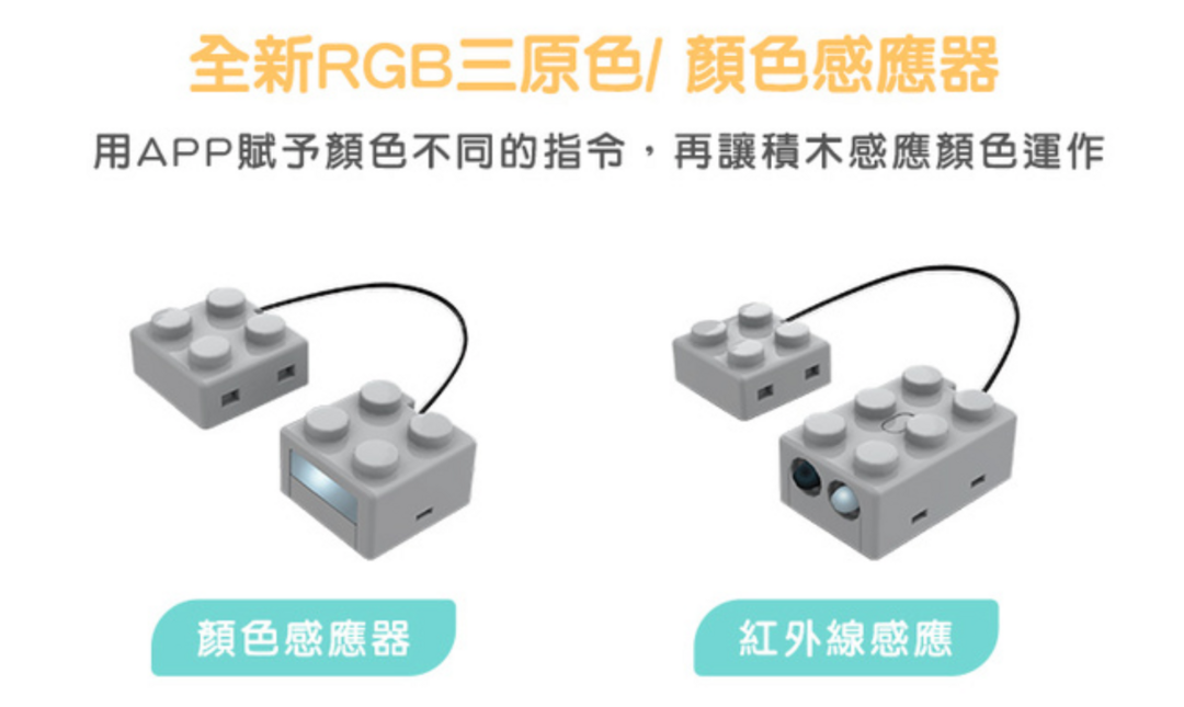除了第一代可以操作的基本功能:遙控、聲控、感應距離與障礙物、錄音、聲光控制,這次我們增添了「顏色感應器」,讓積木可以感應 RGB 三種色彩,讓你的積木更聰明。
