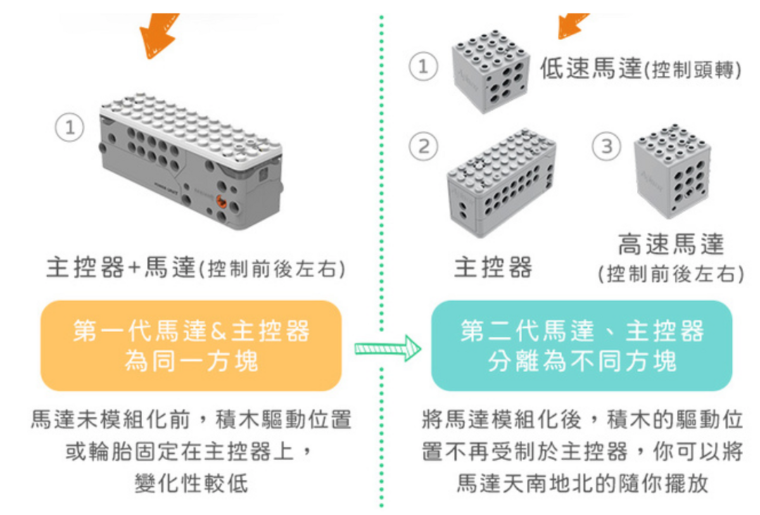 這次我們把主控器和馬達分開了!將馬達模組化後,積木的驅動位置不再受制於主控器,你可以將馬達天南地北的隨意擺放。
