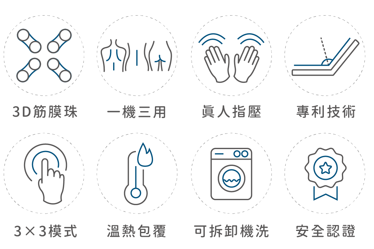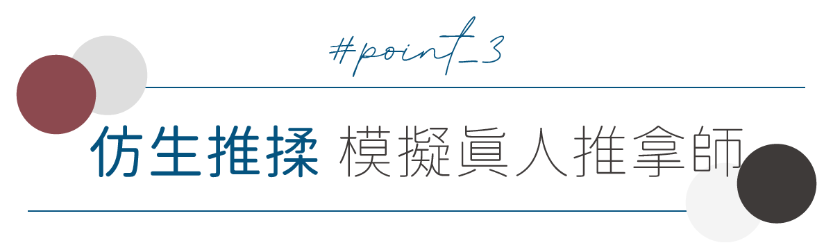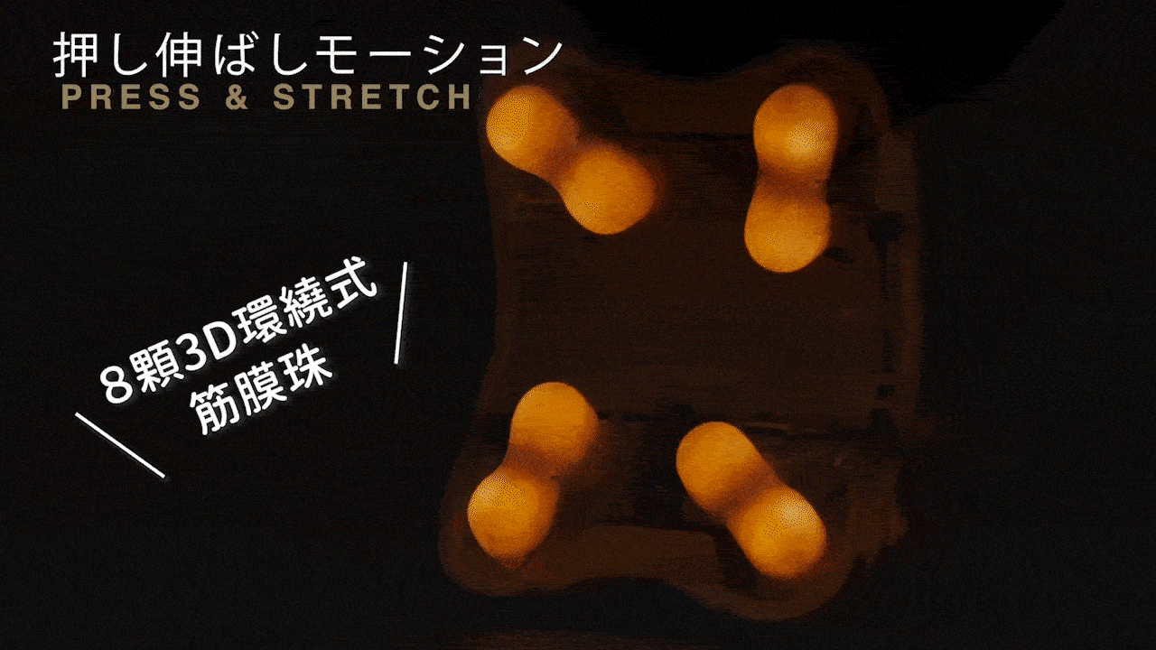 特製溫潤筋膜珠搭配仿生推揉巧勁,模擬推拿師不對稱手技,8 顆筋膜珠+ 8 種轉向,像真正的職人師傅一樣壓揉,層層鬆開大小肌肉群,讓按摩提升到柔和深透的放鬆,避免造成肌肉負荷的反作用。