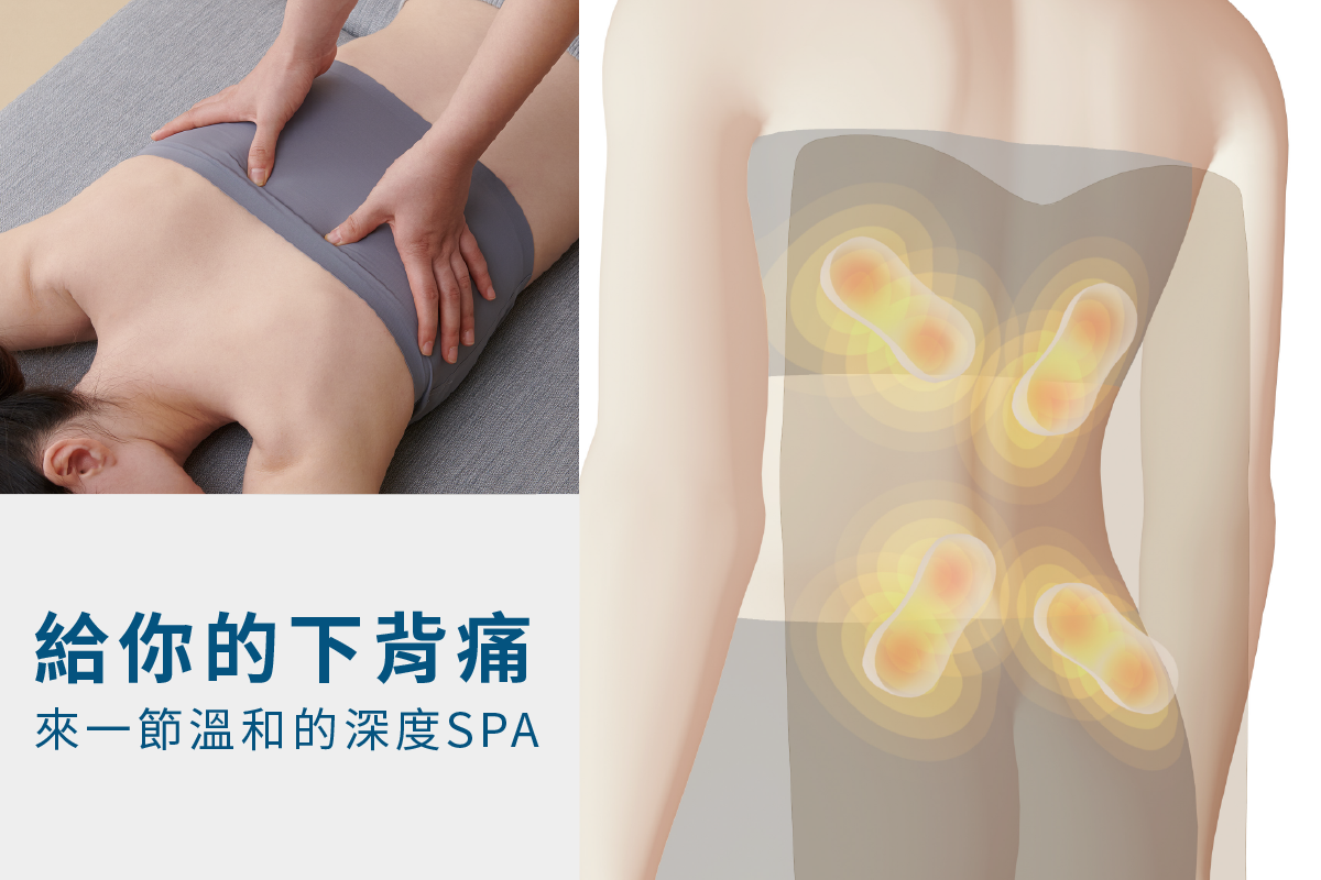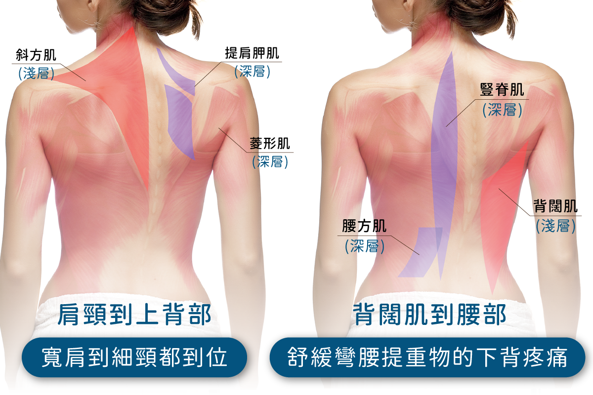 - 腰背:按摩淺層的背闊肌群、深層的豎脊肌和腰方肌。