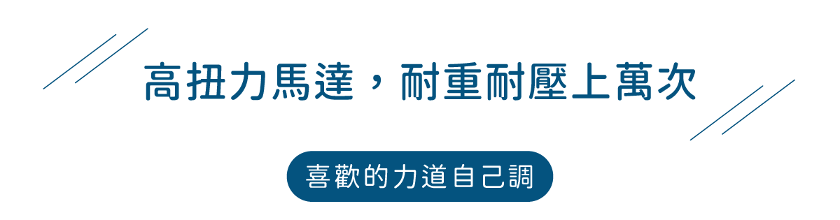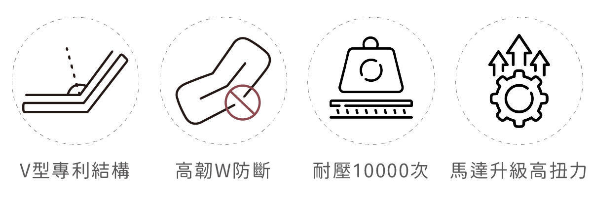 獨家 V 型懸掛彈性結構技術,能自然回貼身體曲線,讓推揉力道更深入。高韌 w 防斷技術,平壓耐受近 180 度,通過實測耐用超過 10,000 次!