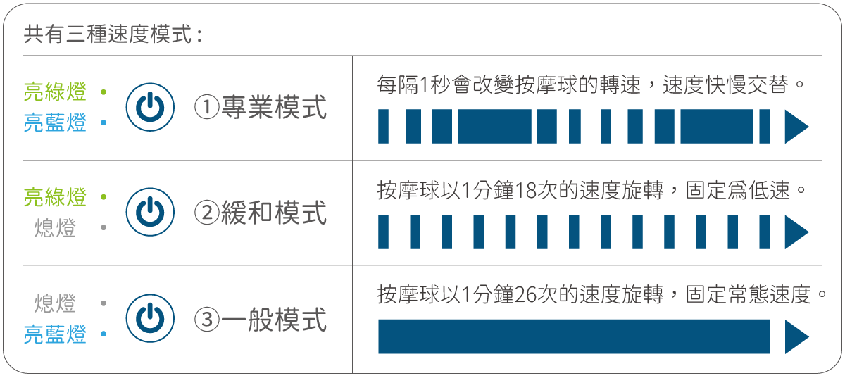 特規級 3 種速度模式x3 種轉向調整,高達 9 種模式,打造更貼近客製需求的紓壓體驗,適應各種程度疲憊情境。