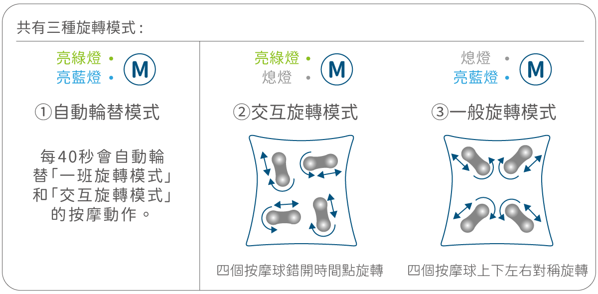 .三種旋轉模式變換,貼近客製需求,讓按摩椅墊更加人性化。