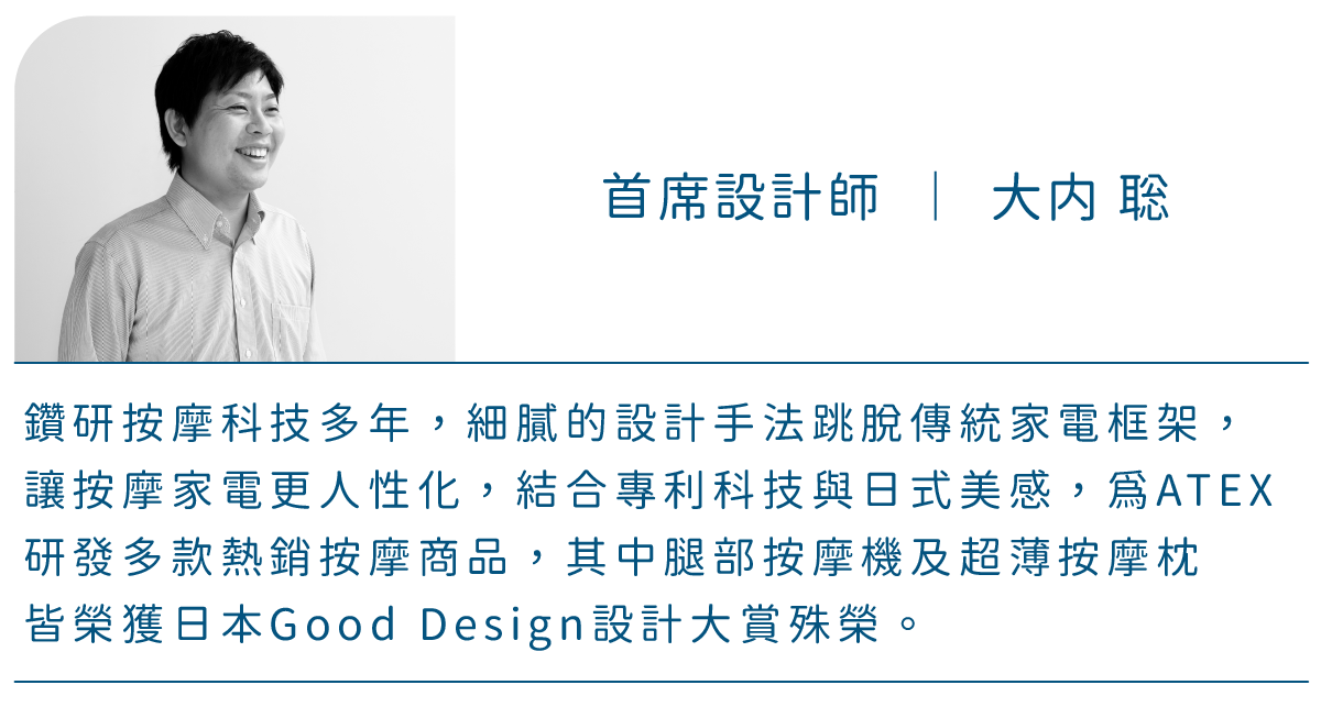 1992 年成立至今,深受日本女性喜愛,累積 30 年消費者好評,各大媒體輪番報導,2019~2021 年連續三年榮獲日本 Good Design 設計大賞,奠定 ATEX 成為日本按摩家電業界指標性品牌。