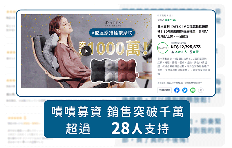 日本 ATEX|V 型溫感推揉按摩枕於嘖嘖募資突破 1,526 萬元