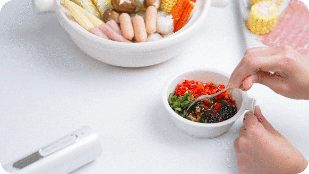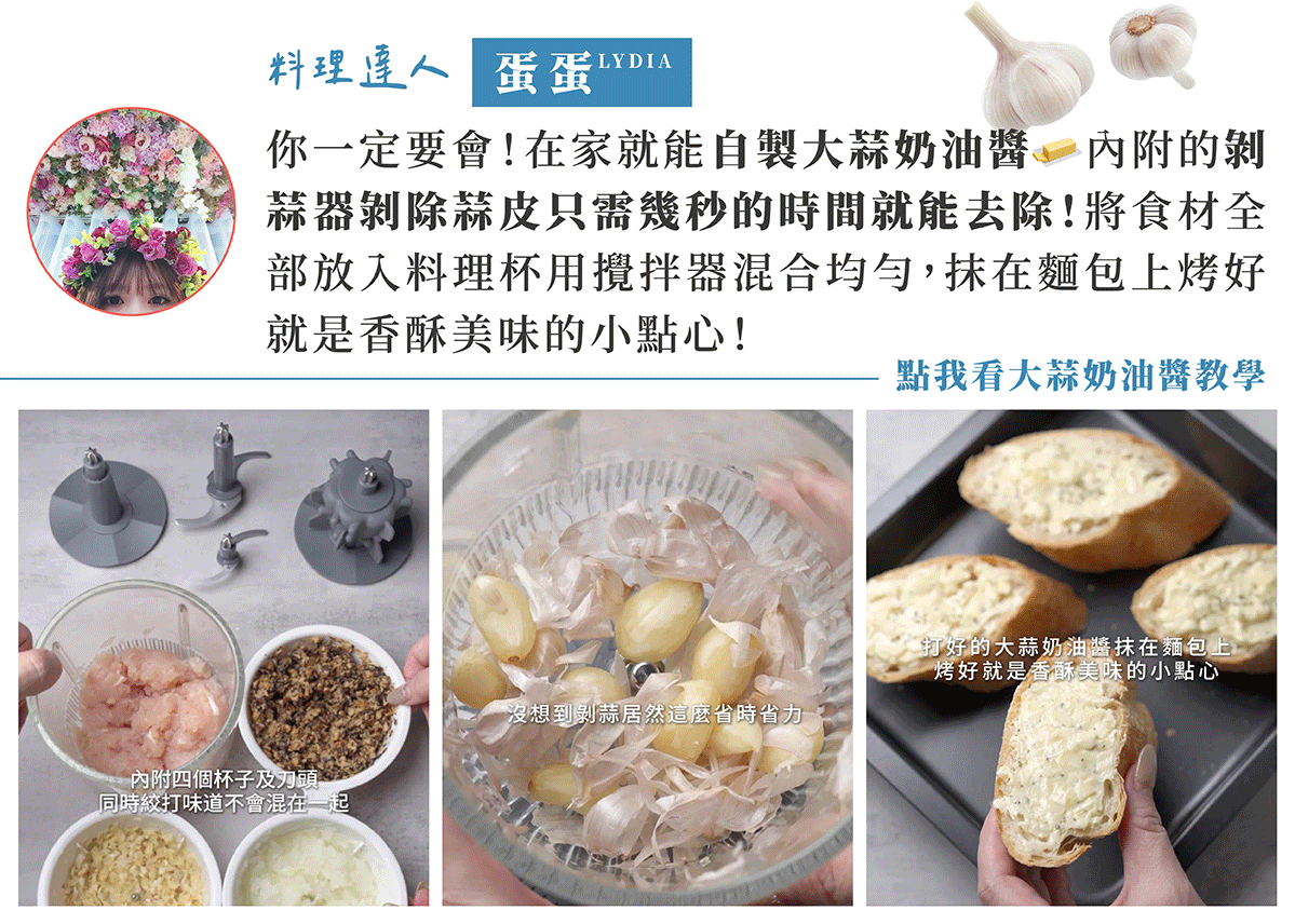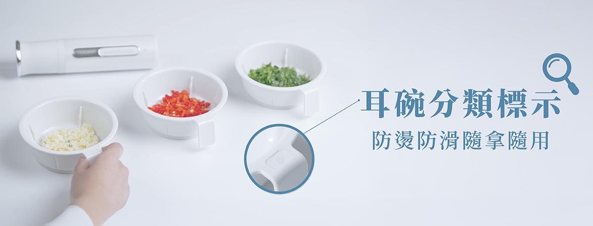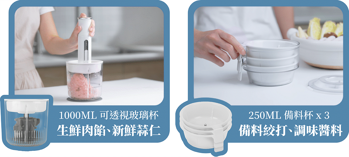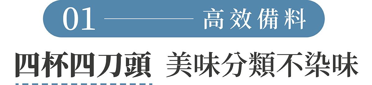 每一個備料料理杯上都有獨特的小符號,能輕鬆辨別不同的佐料,便於分類食材,只需將需處理的食材分杯裝好,調理機戳上即可立即絞打!