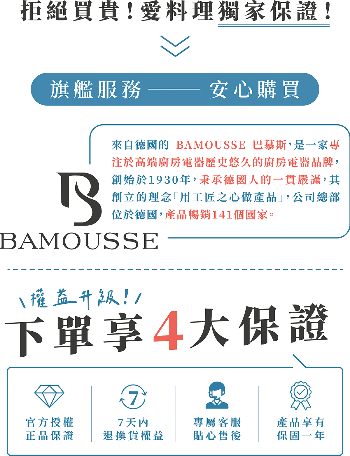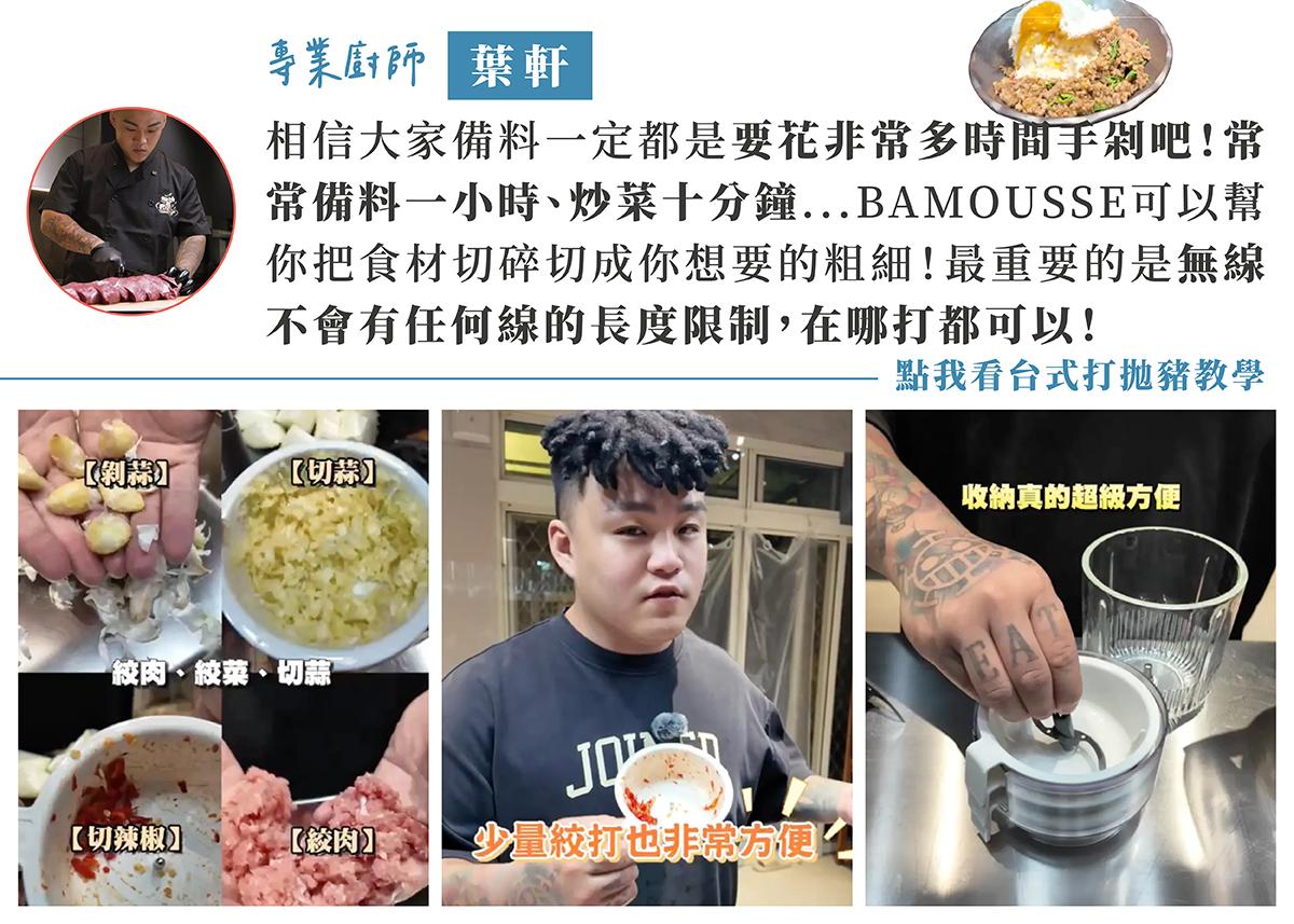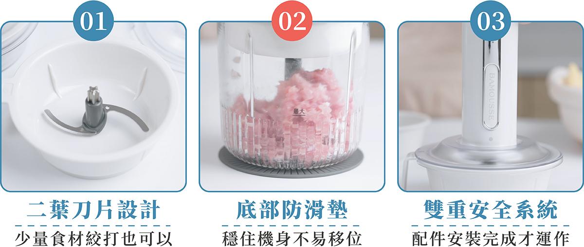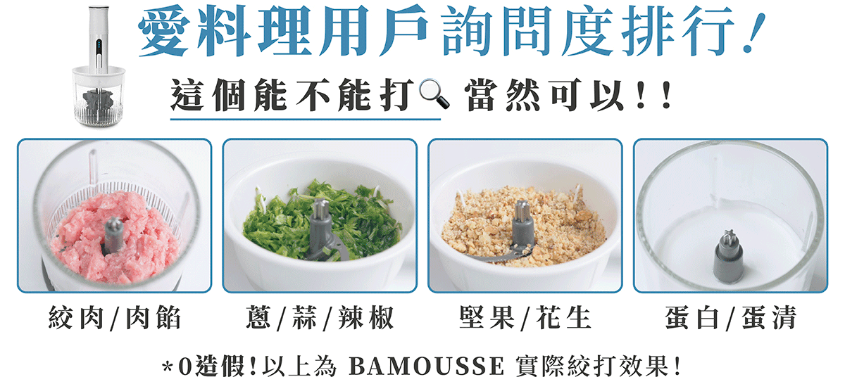 BAMOUSSE 領先業界,配備四個料理杯和四個不同的料理刀頭,可以根據食材選擇適合的料理杯和刀頭。