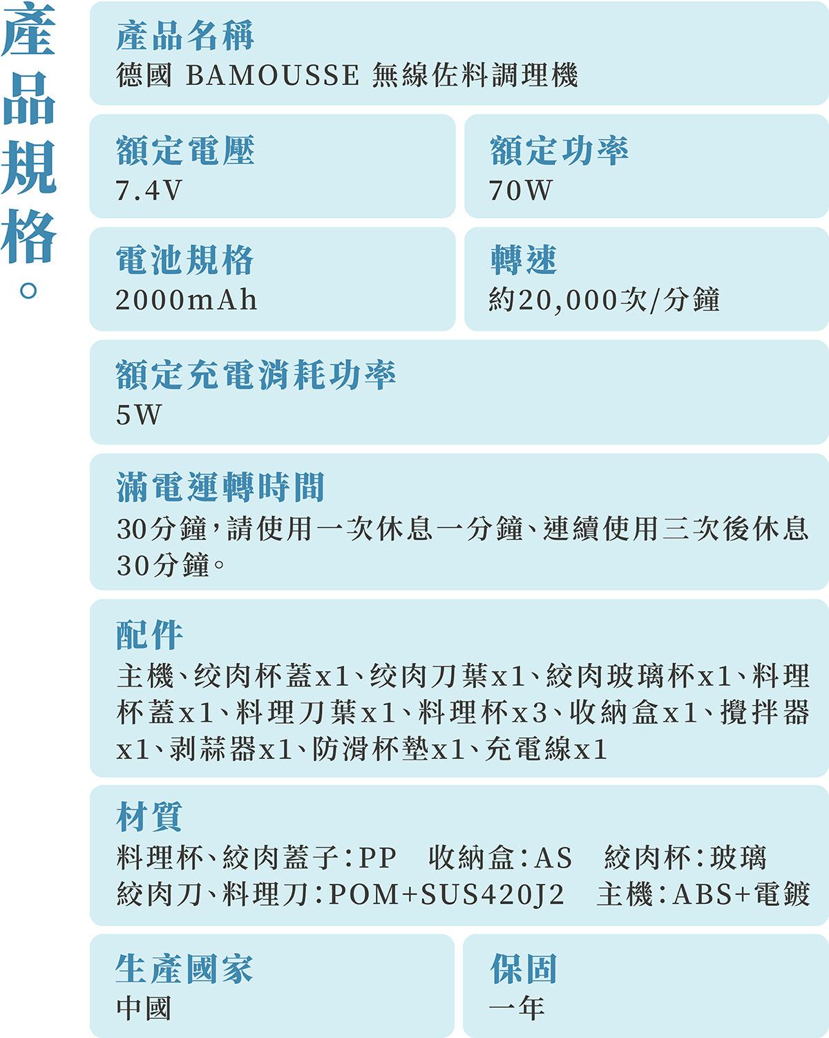 使用調理機再也不受「線」制!主機上三格燈號即時顯示電量,簡單三步驟即可無線絞打!為延長調理機壽命,建議使用一次休息 1 分鐘,若連續使用三次後請休息 30 分鐘。