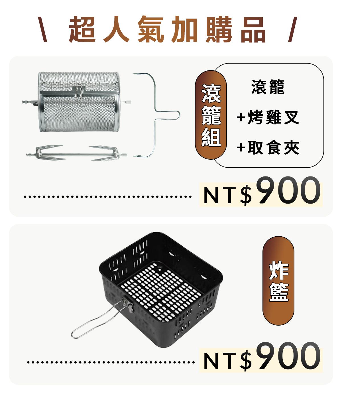 材質:烤盤 鍍鋁板/烤架/滾籠/烤雞叉/取食夾 304 不鏽鋼/炸籃 鋼板+不沾塗層/接水盤 PP材質