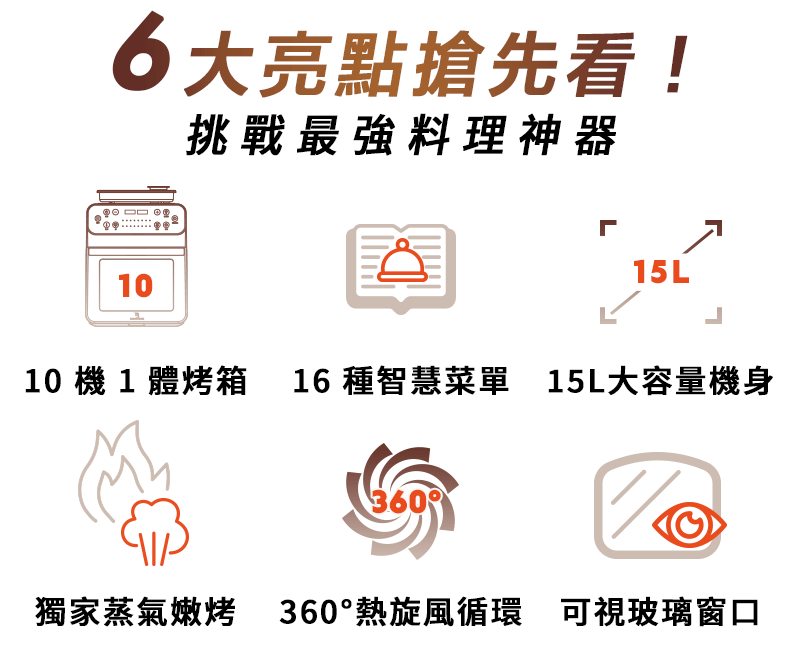 全能料理烤箱,一機取代日常十種家電,不僅高效省時還能釋放更多餐廚空間!懶人烹飪新選擇, 16 大內建料理菜單,智能大廚幫你搞定!