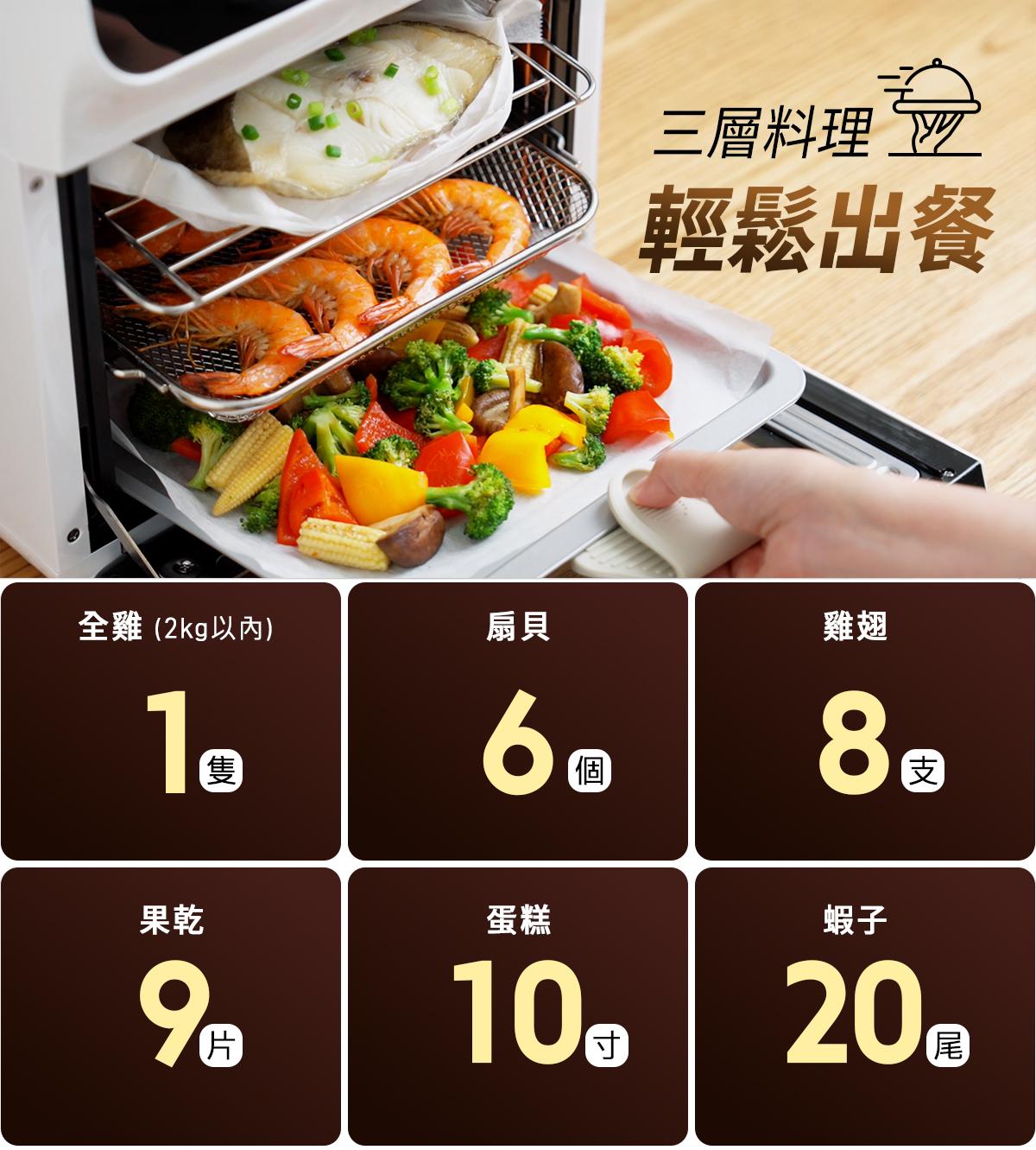 15L 大容量設計,一次三層同時烹煮食材,無論是家庭聚餐、派對料理,都能滿足各種使用情境。(15L 為整個烤箱內膽含發熱組件及風扇空間)