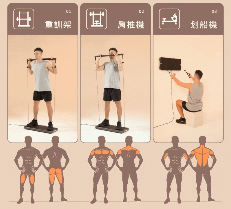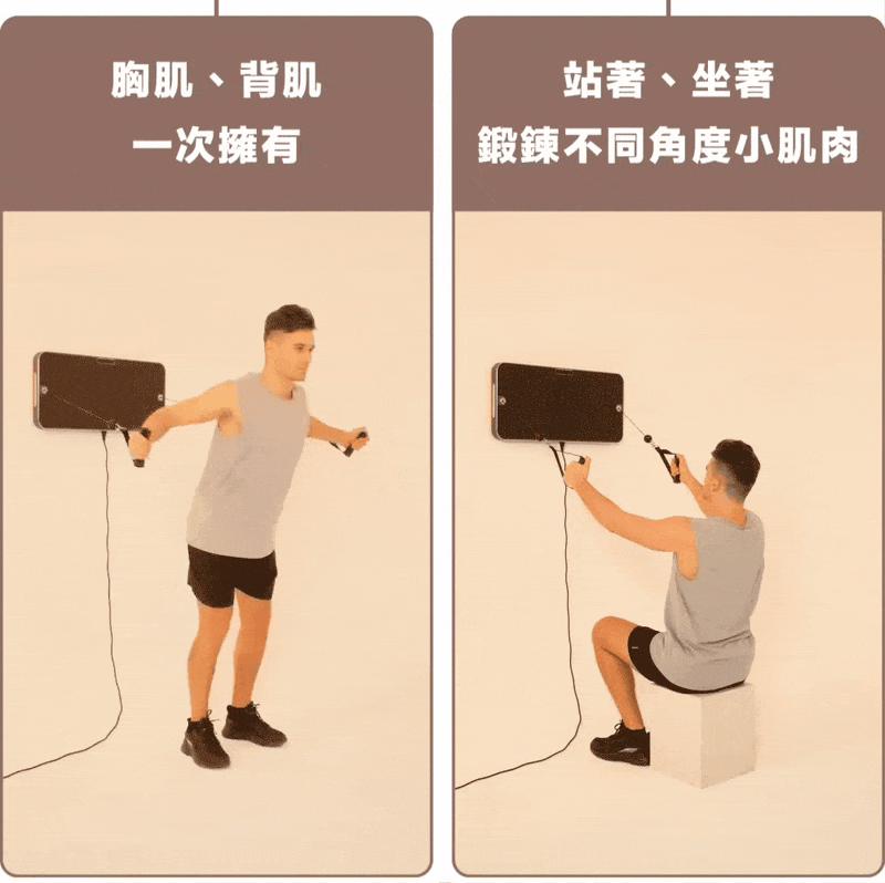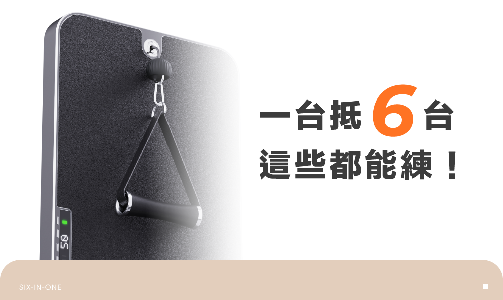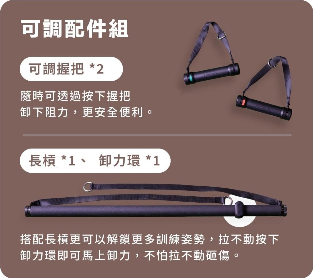 對應訓練部位,換上手把、腰帶、腳踝綁帶,再調調重量,3 分鐘內就像換一台機器一樣,幫你切換訓練模式!