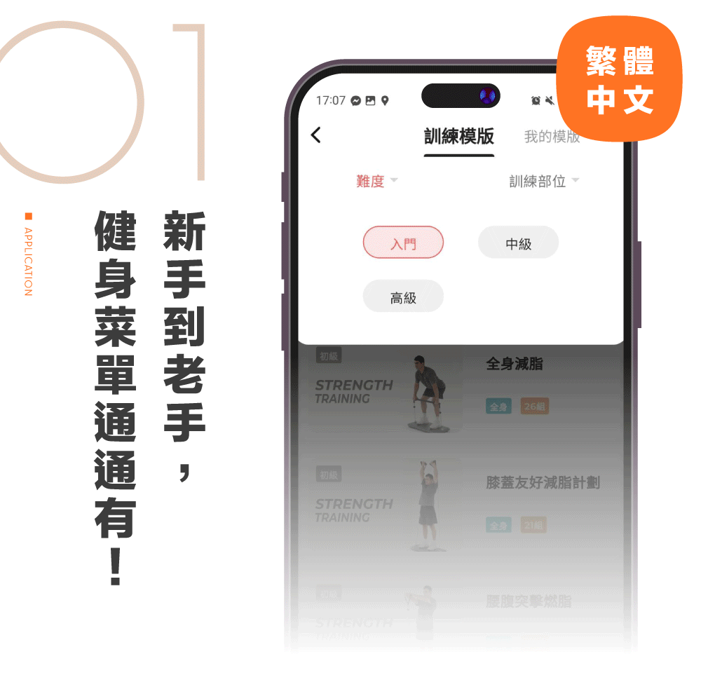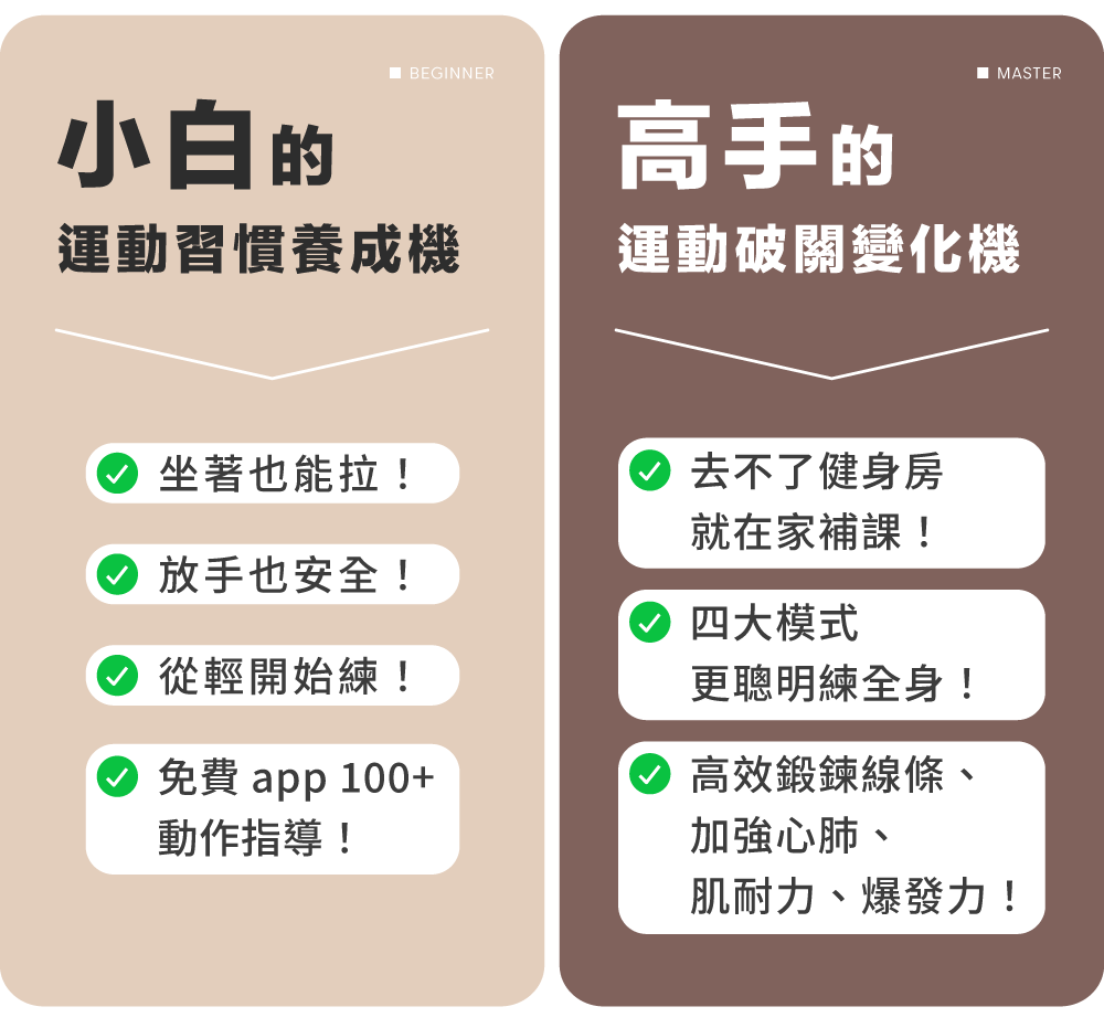 適合剛開始接觸運動的人,主要用於基本力量訓練、養成運動習慣、增強體力。雨天颱風天去不了健身房,在家補課也可以用這個模式!