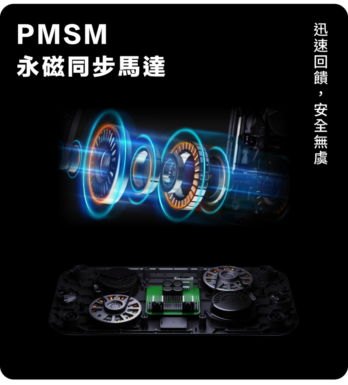 我們採用 PMSM(永磁同步馬達)作為重訓器材的阻力,代替傳統的配重鐵塊,通過「改變電流大小」精確控制阻力,所以才能打造非常輕到非常重的廣泛阻力範圍。