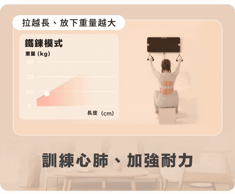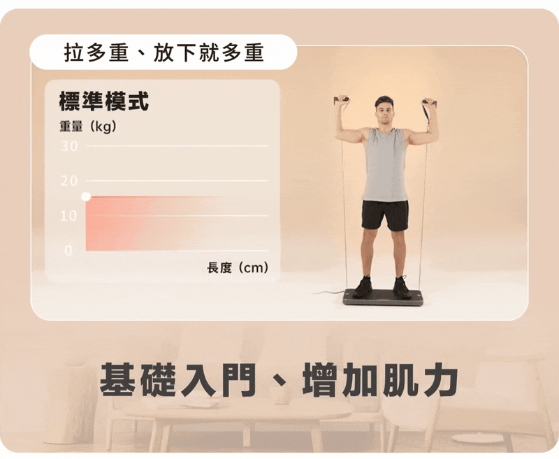 適合想增加肌耐力、活動力的人,特別像是有在登山的人、長輩訓練肌耐力。隨著拉動距離的增加而增加阻力,在過程中練習平穩過渡,強化心肺和肌肉耐力,增加元氣、改善疲勞、增加耐力,更輕鬆應對日常活動!