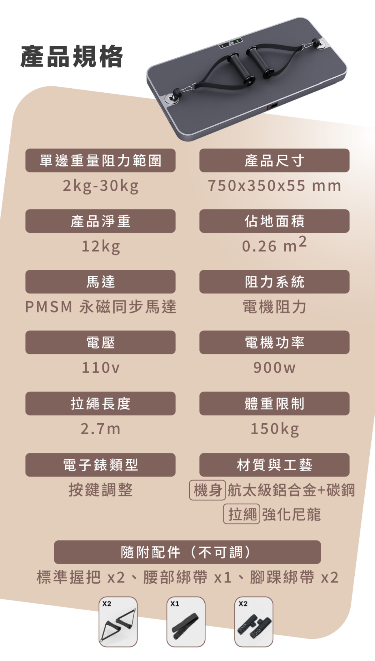 • 雙邊為同步調整,力量阻力同步,單邊拉力範圍為 2-30KG。