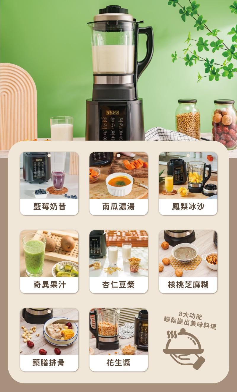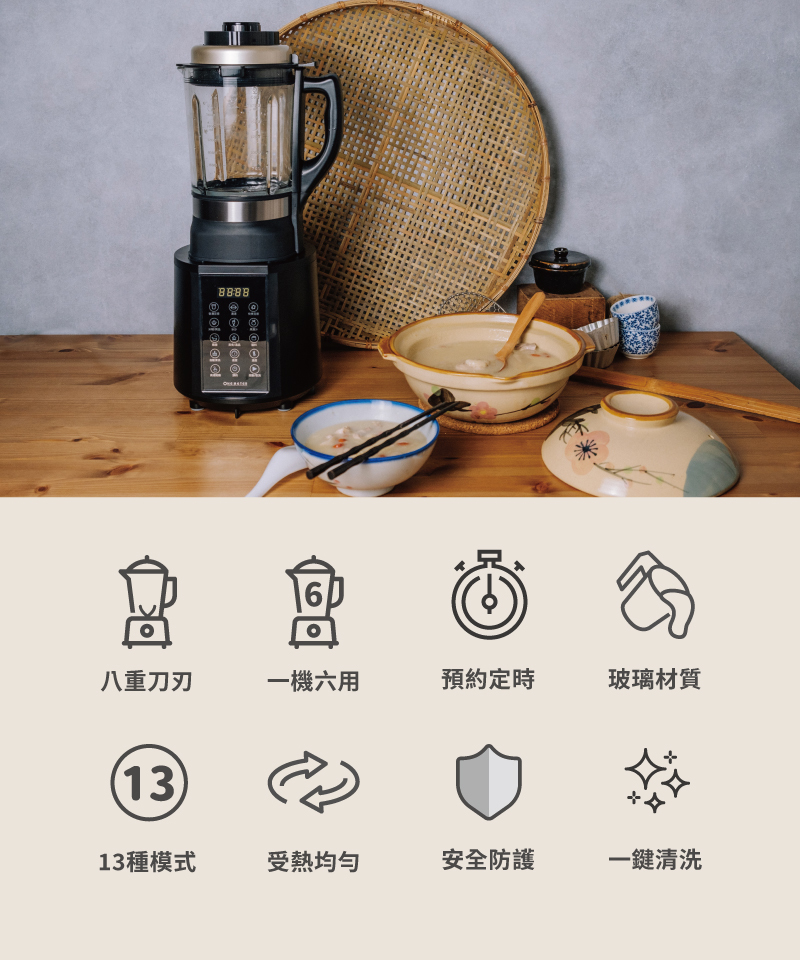 智能高速食物調理機,內建 13 種智能模式,冷熱料理皆可完成;高速破壁營養不流失,運作時可形成 360° 高速漩渦,創造更細膩口感,高硼矽耐熱玻璃,使用安心耐冷熱溫差,方便徹底清洗!