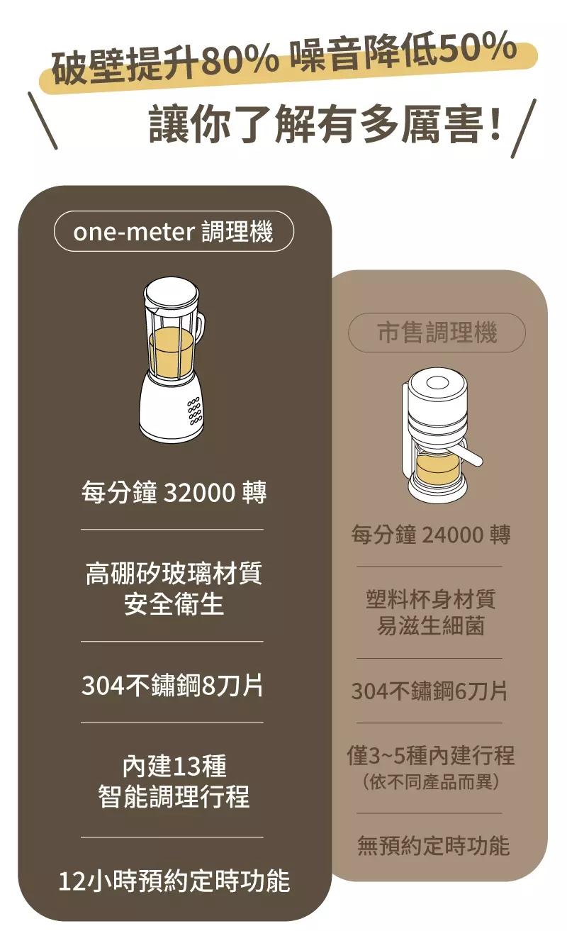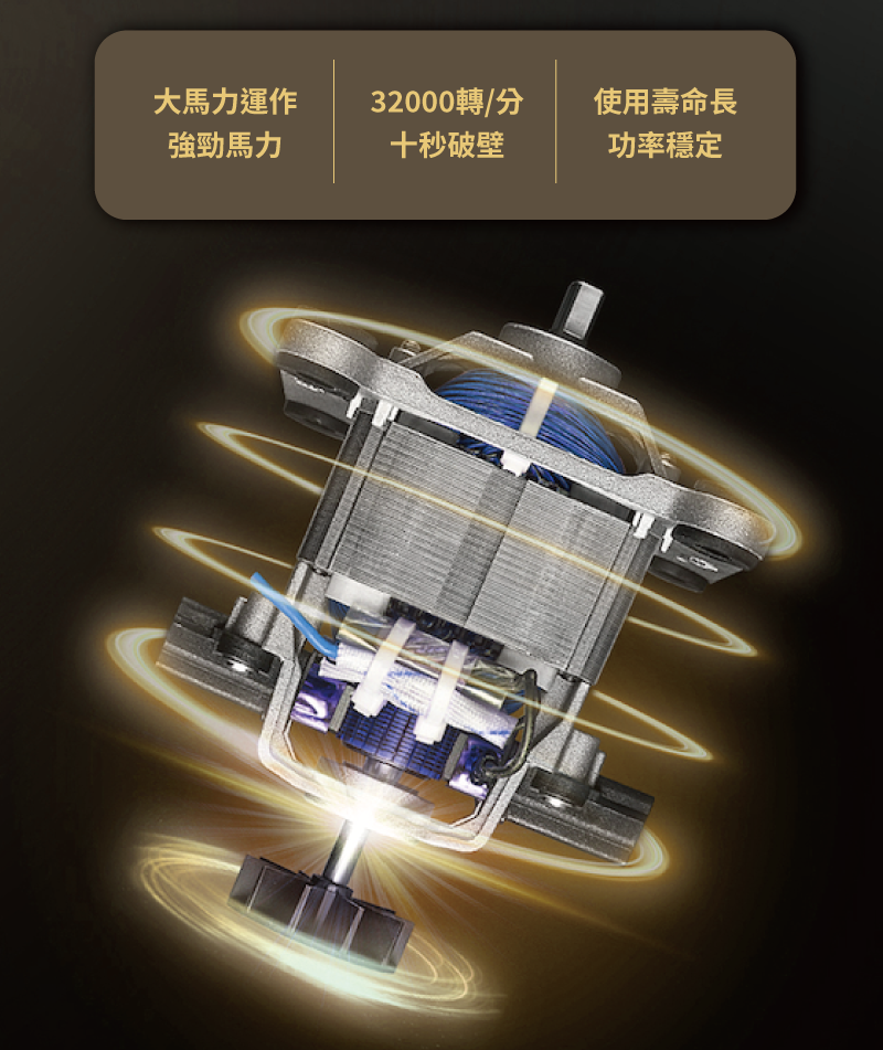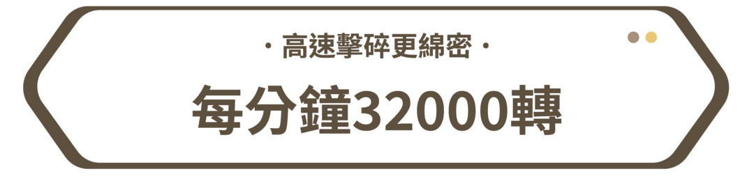高效能 32000 RPM 規格馬達,利用高轉速的功能,能瞬間擊破食材細胞壁,將食材打碎至細小的分子!