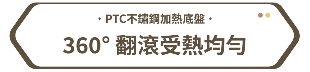 採用 PTC 不鏽鋼加熱底盤,加熱時可 360 度均勻翻滾受熱,不用擔心食材受熱不均與安全耐熱的問題。
