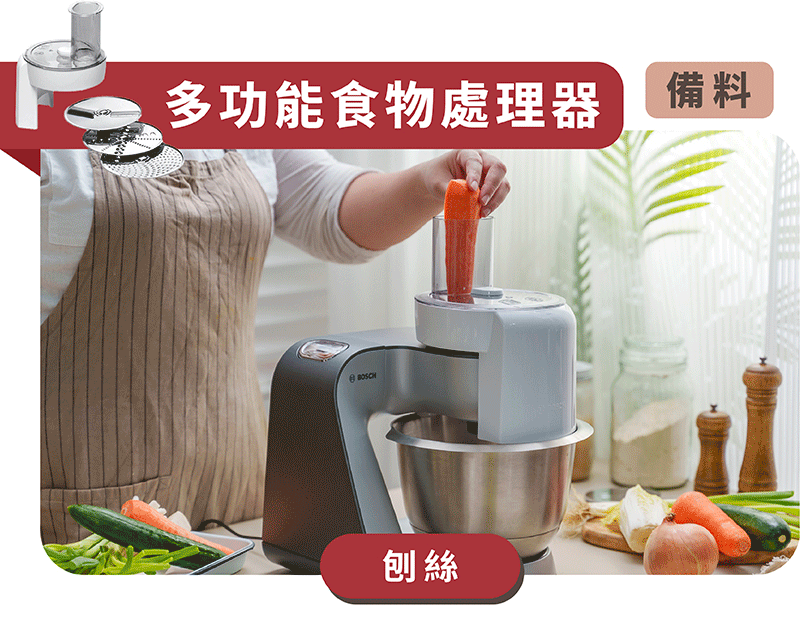 使用多功能食物處理器,讓你一次擁有多種功能,研磨、刨絲、切片等功能,減少更多平常處理食材時要花的時間。