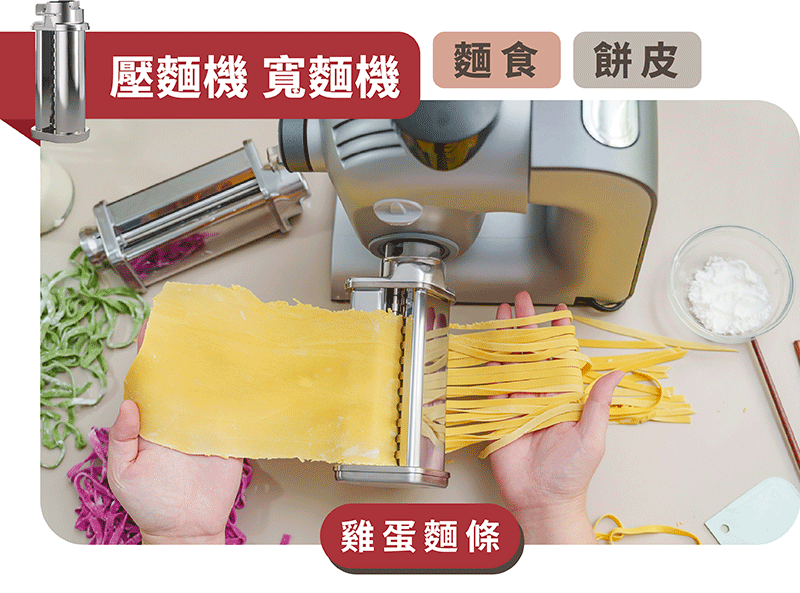 愛料理贈送麵食創享組(壓麵機與寬麵機),方便在家也能做麵條、餅皮、水餃皮等多種麵食料理。