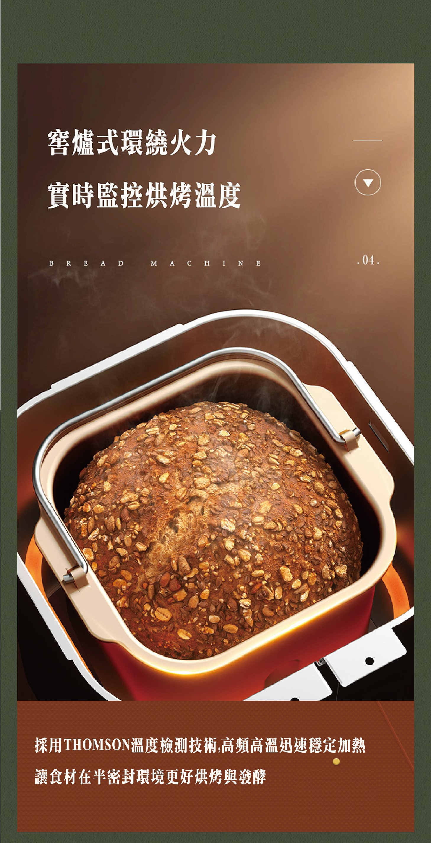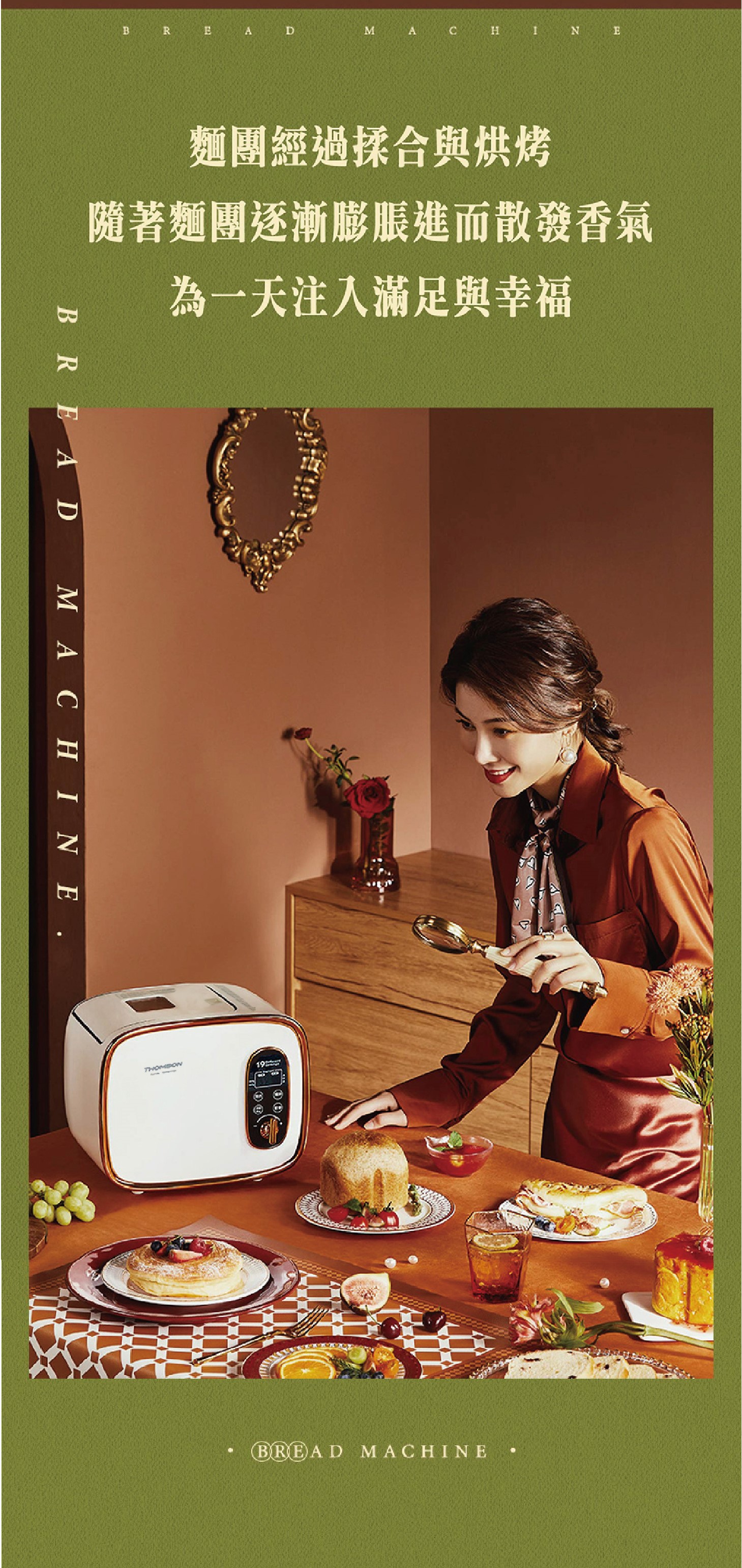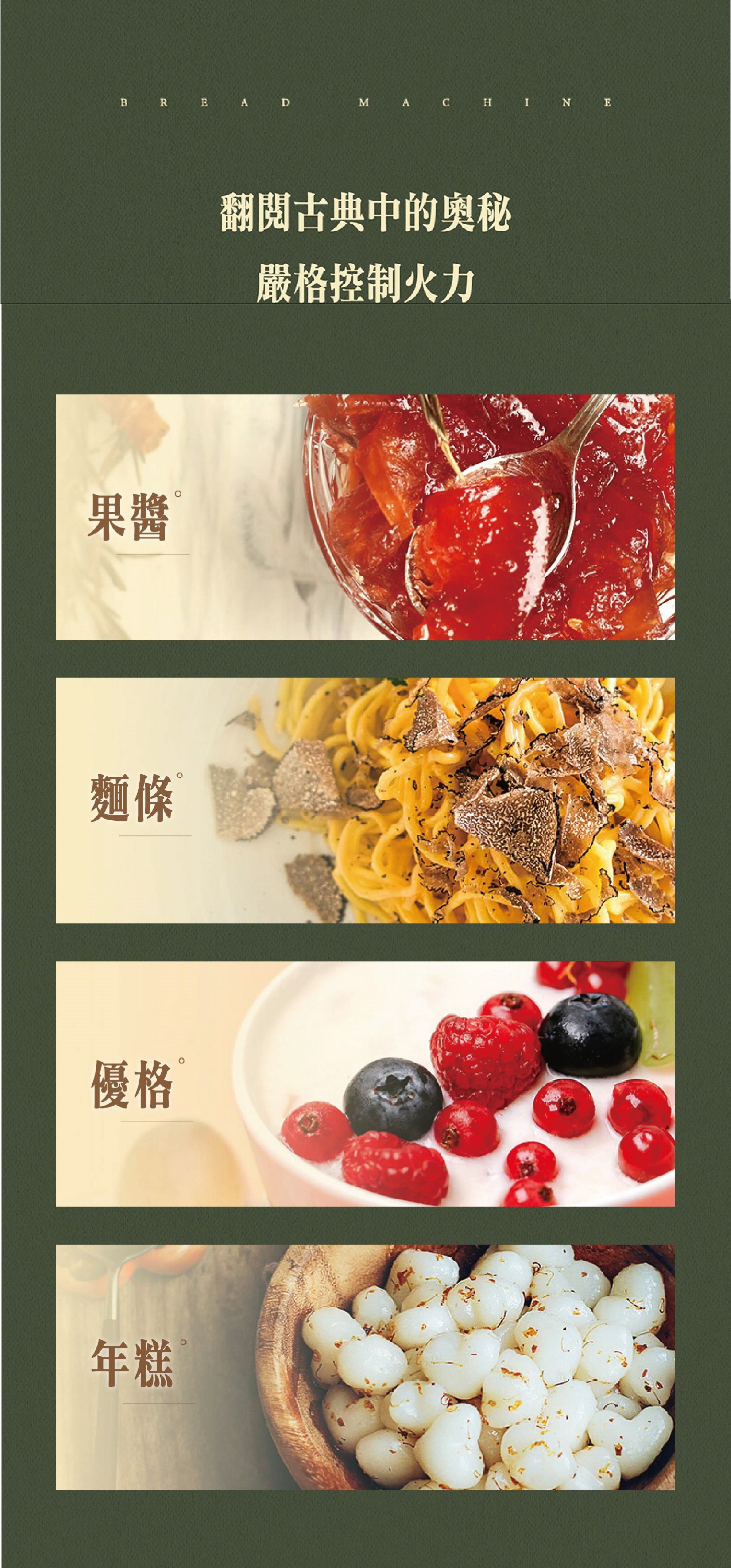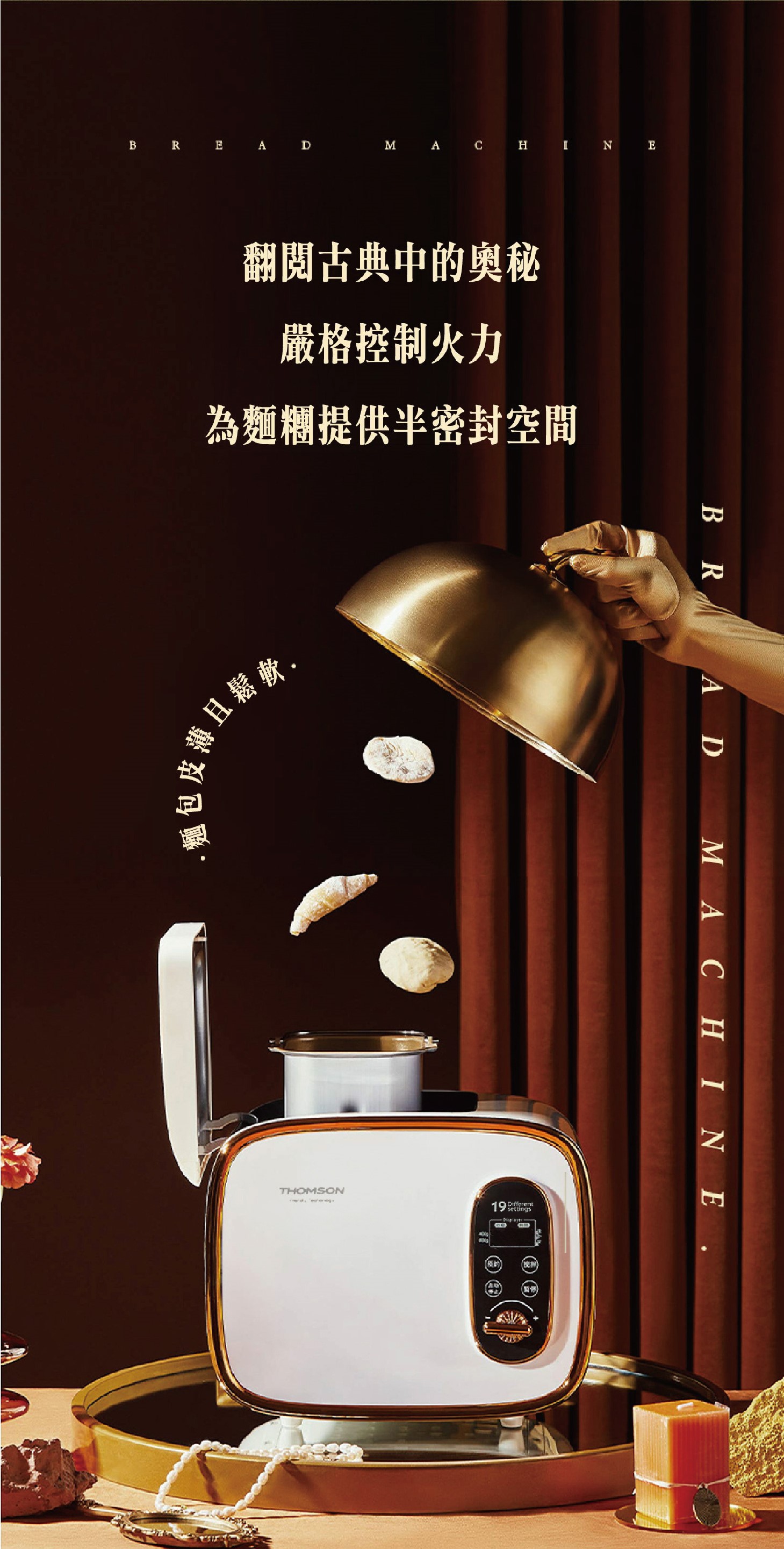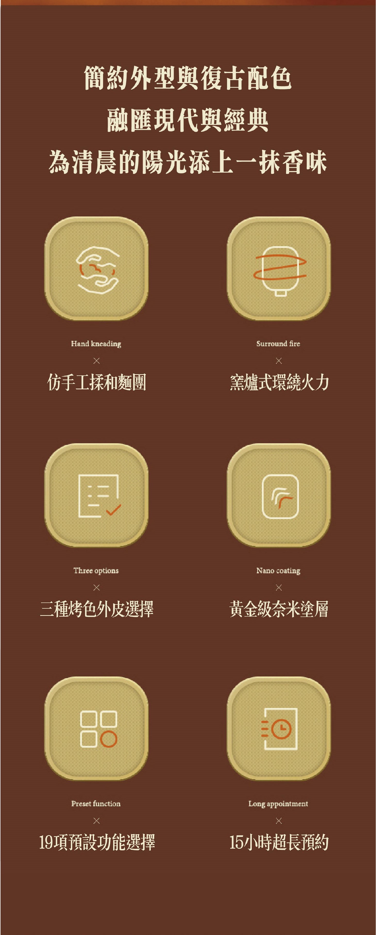 一台顏值與內涵面面俱到的新美學家電,擁有復古造型設計,低調金屬高質感,讓麵團用仿手工的揉合,窖爐式環繞火力,烘烤出迷人的香氣與酥脆外皮,智能預設 19 種功能,除了烘焙麵包之外,製作麵條、果醬、優格、年糕等也沒問題!