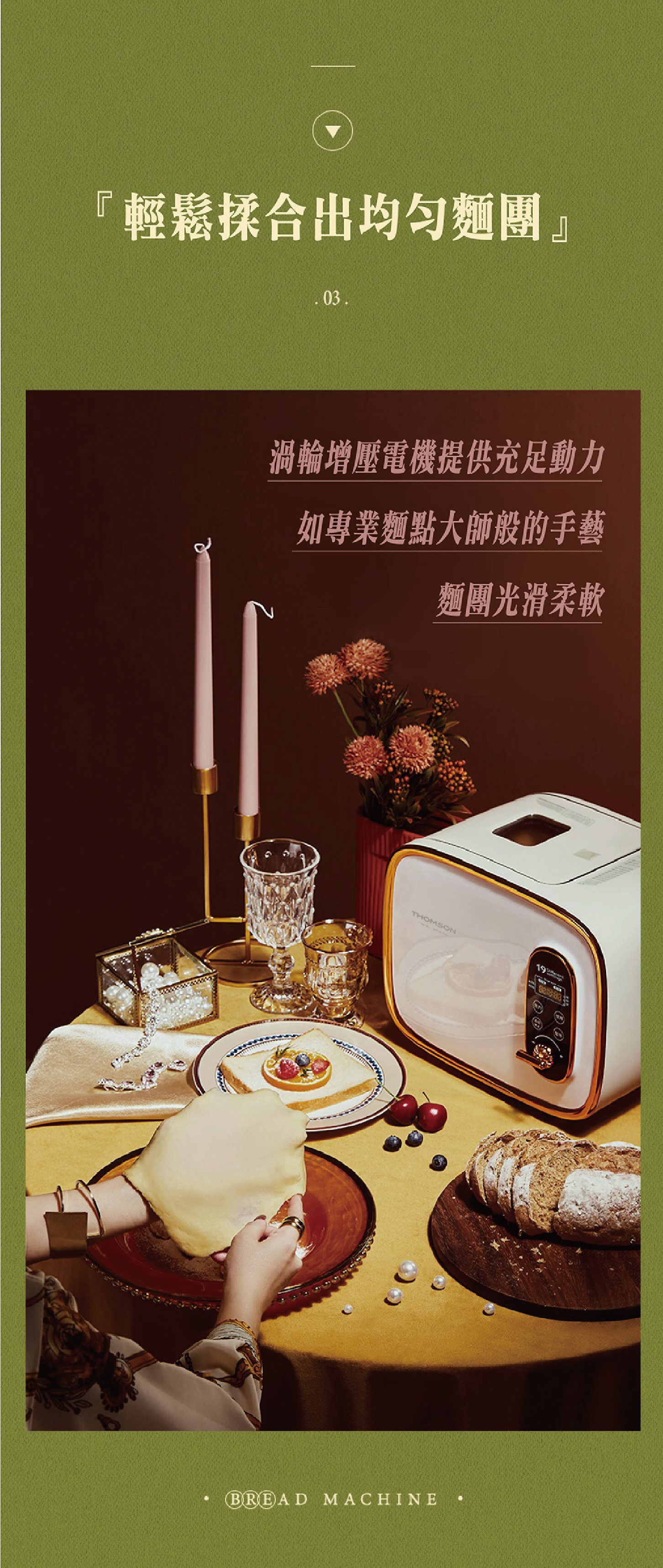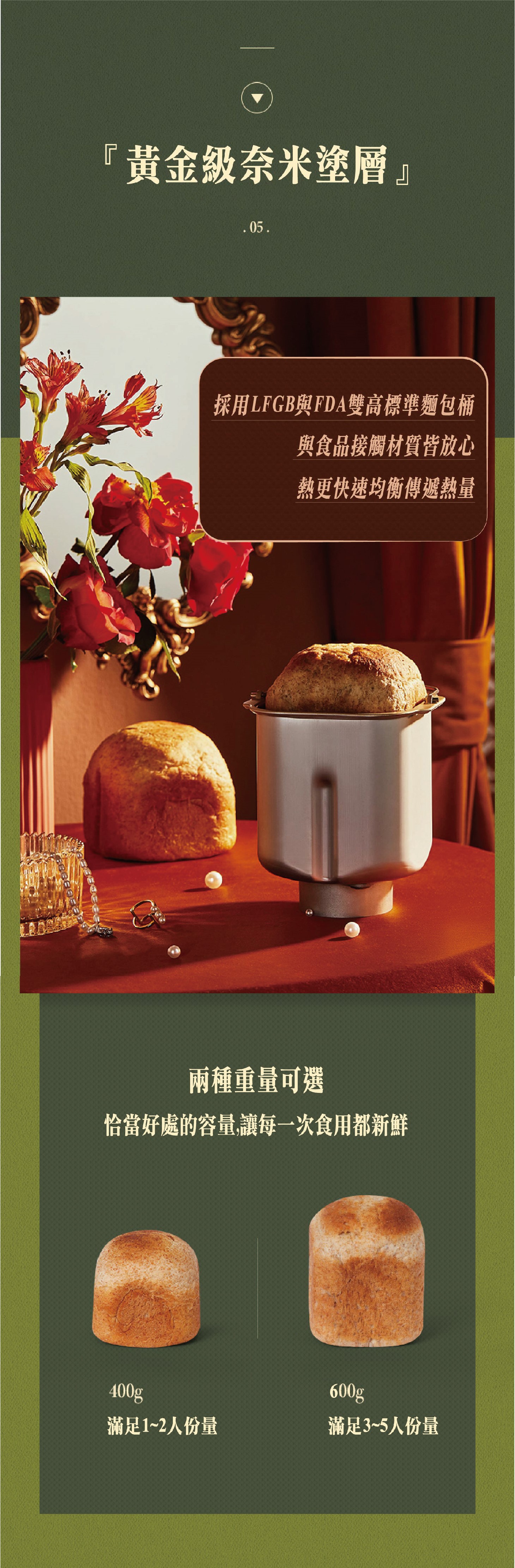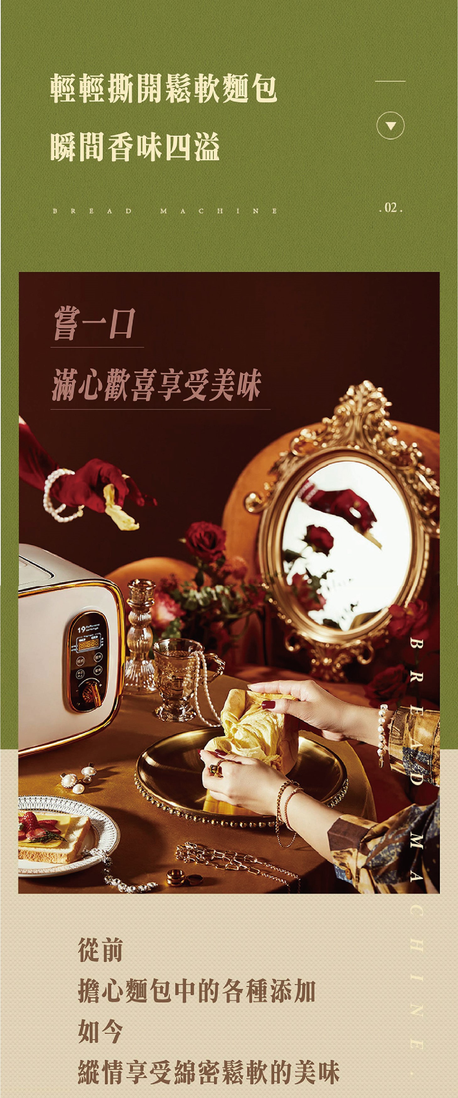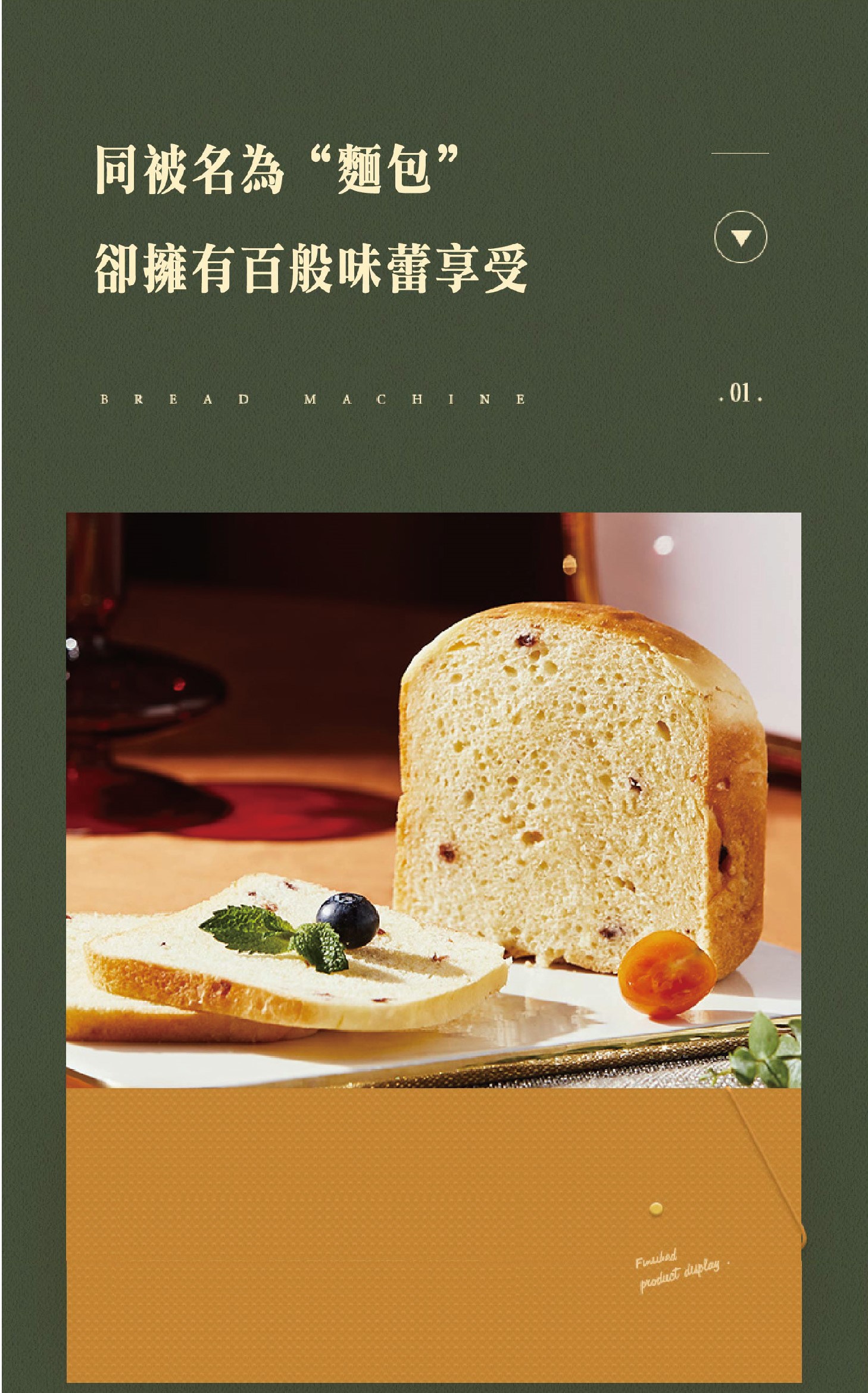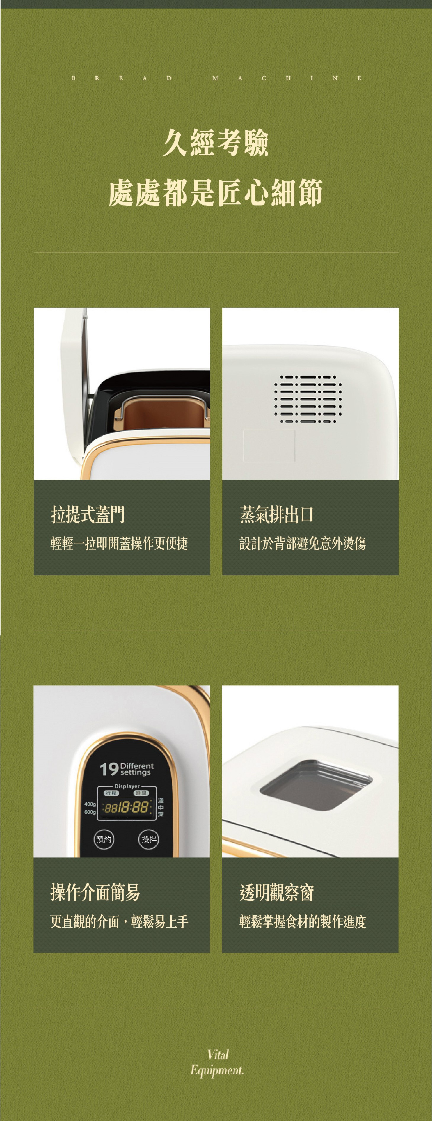 一台顏值與內涵面面俱到的新美學家電,擁有復古造型設計,低調金屬高質感,讓麵團用仿手工的揉合,窖爐式環繞火力,烘烤出迷人的香氣與酥脆外皮,智能預設 19 種功能,除了烘焙麵包之外,製作麵條、果醬、優格、年糕等也沒問題!
