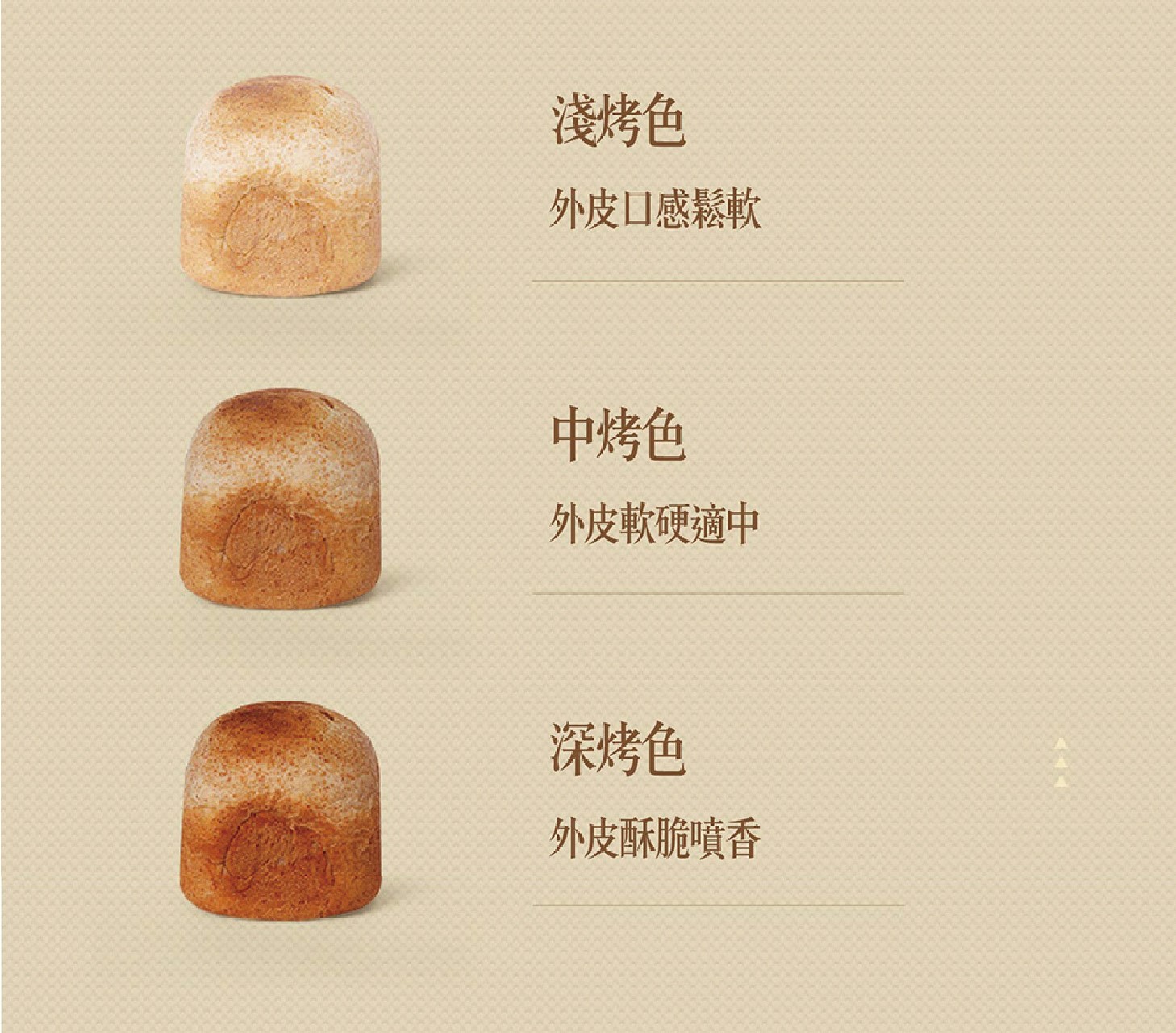 - 三款烤色設定,選擇鬆軟、酥脆等口感