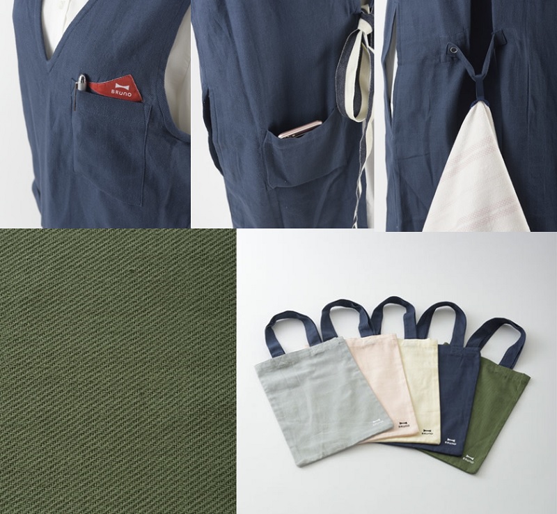 女性的料理工作服圍裙,除了舒適度與修身美感外,BRUNO秉持著日系產品的細膩,即使穿著圍裙,也能輕易的的穿越圍裙,到自己的衣褲口袋取物,搭配上同色系的小提袋,讓收納料理裙更方便。