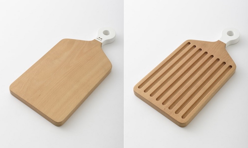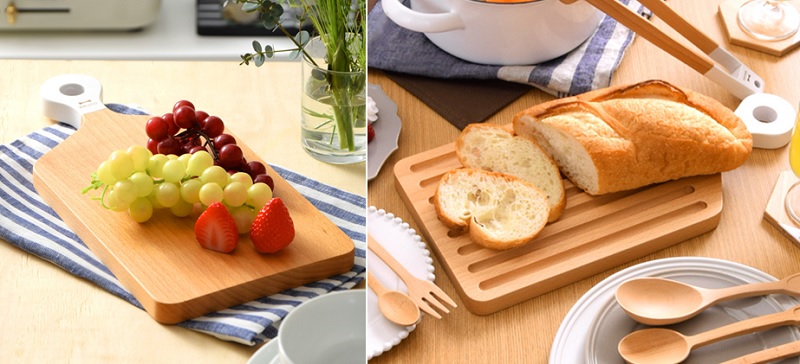 原木兩用砧板,正面可作一般處理食材的砧板,另一面可供切割麵包時使用,特殊的凹槽設計,在切割麵包時,麵包屑會掉落凹槽內,不需擔心麵包屑會讓桌面髒亂。