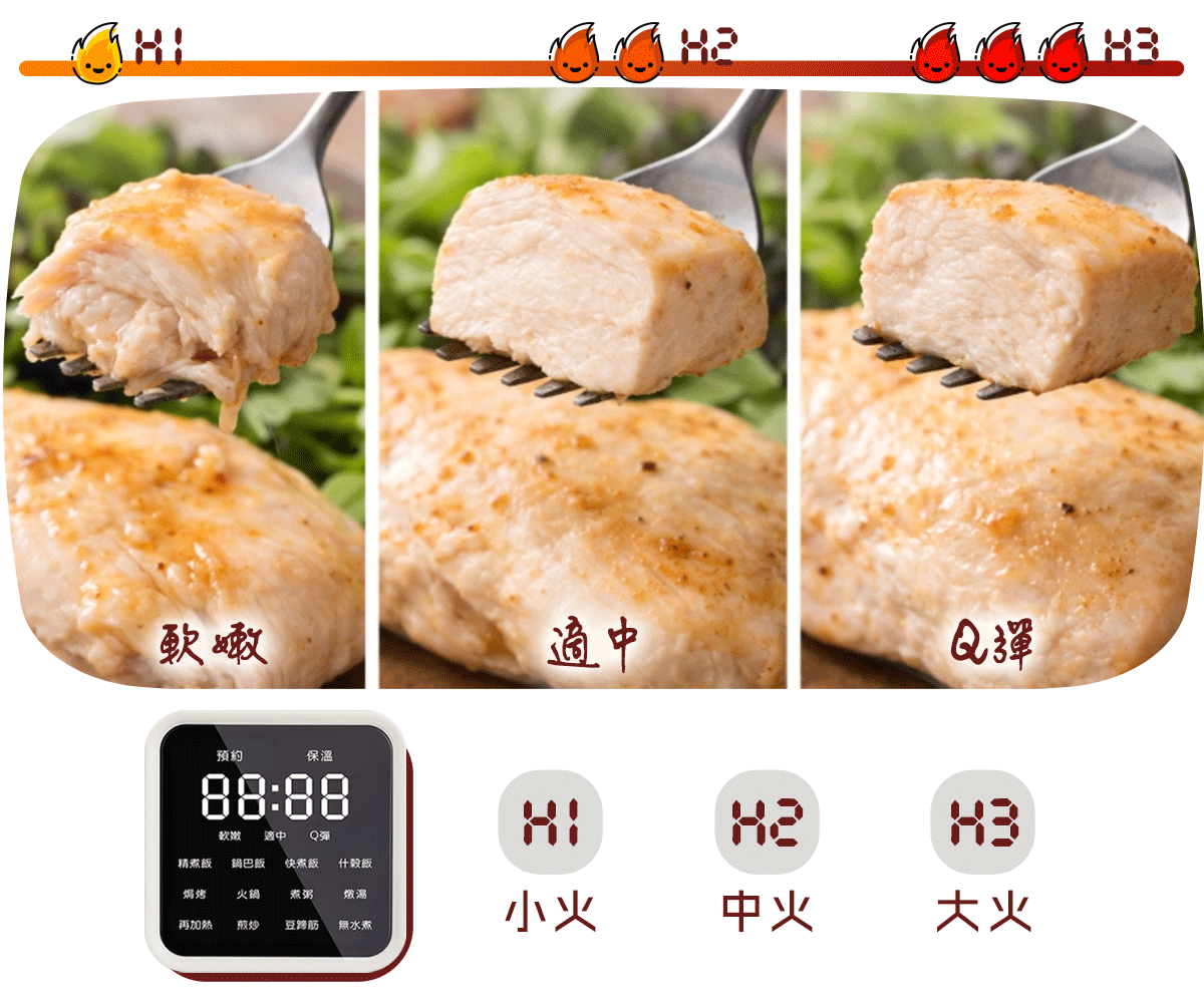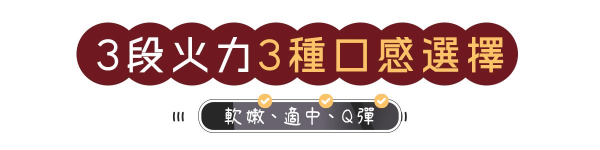 - 3 種口感,軟嫩、適中、嚼勁自由切換