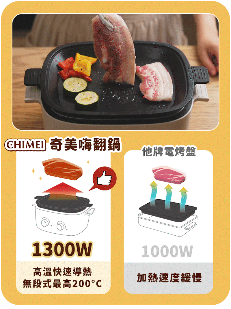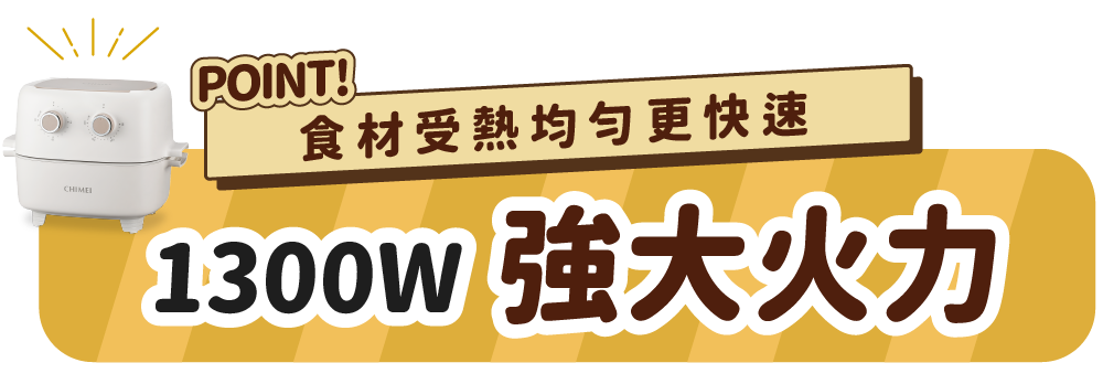 擁有 1300W 強大火力,無段式最高可達 200 度,精準加熱均勻烹調,有效提升加熱效率!