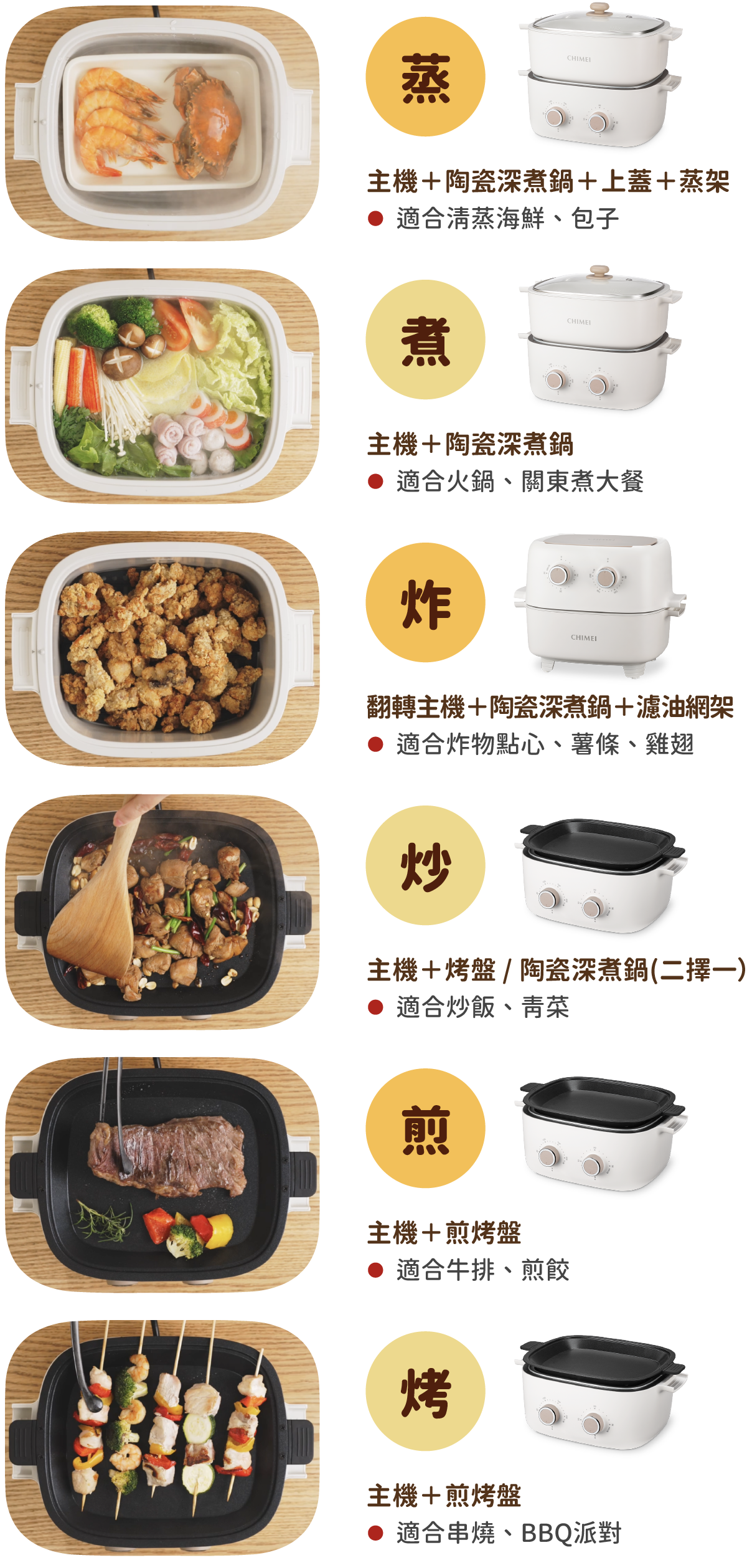 擁有清蒸、燉煮、氣炸、快炒、平煎、燒烤等功能,可依照料理需求自由選擇,不管是全家人的聚會或是三五好友美食趴都能一同享樂,盡情享受美味料理!
