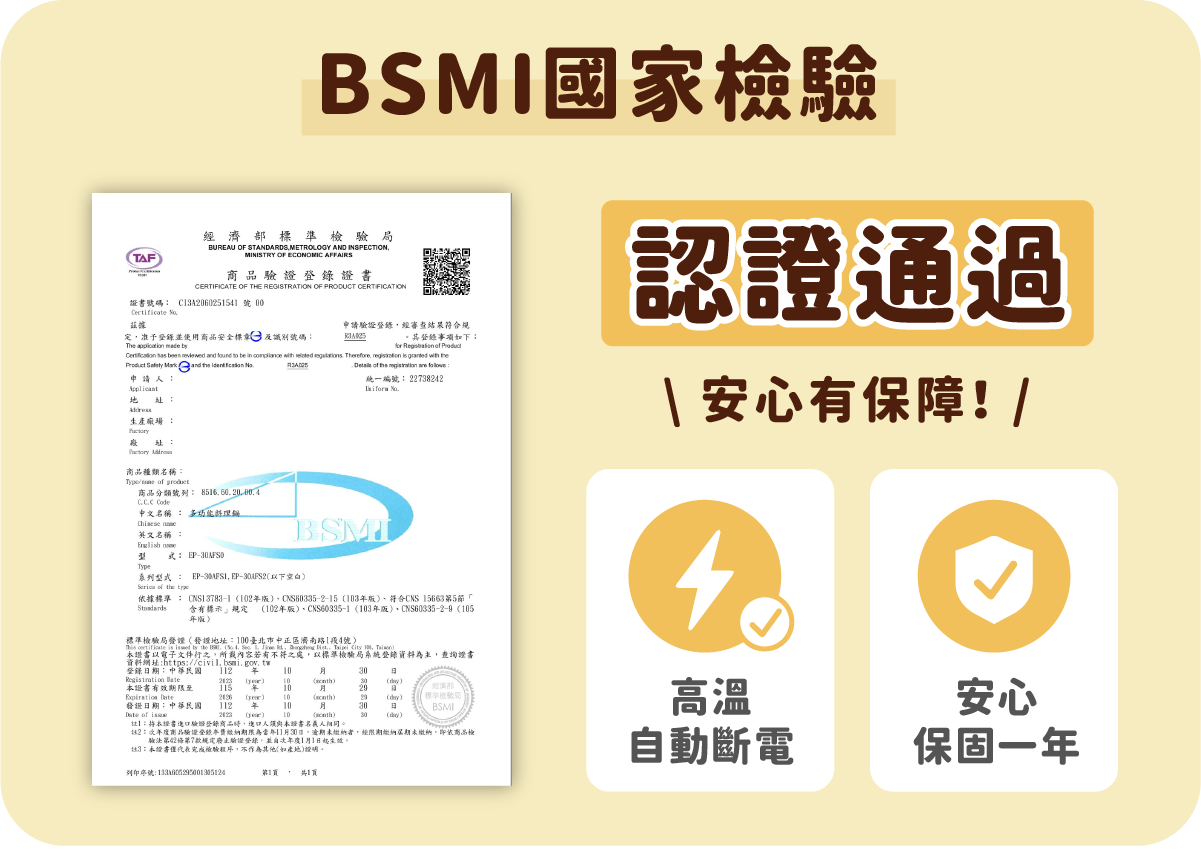 符合國家 BSMI 安全認證,自動斷電防乾燒設計,讓家人使用起來安心有保障。