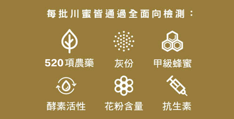川蜜嚴格把關【蜜源檢測】確認不以糖水養蜜、無毒無污染。承諾製作過程完全無化工、不混其他花蜜或人工糖漿,每一批都經過 520 種農藥、抗生素等多項檢測,超越國家甲級蜂蜜標準。