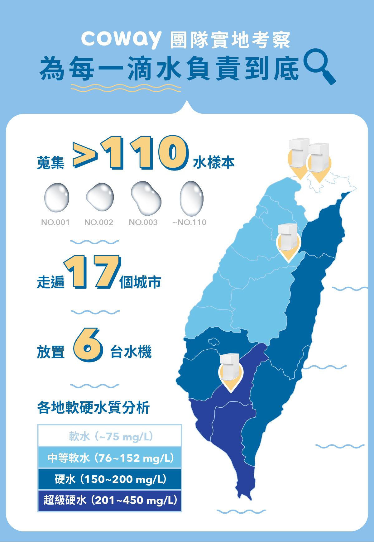 Coway 研發團隊於北中南共放了 6 台機器測試,搜集台灣 17 個城市、110組以上的水樣本,深入全台調查,量身打造最適合台灣各地水質的飲水機!