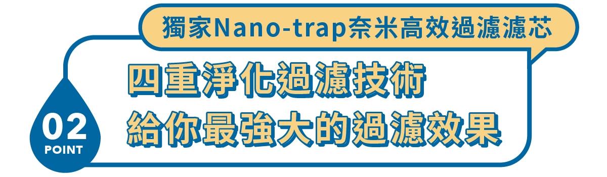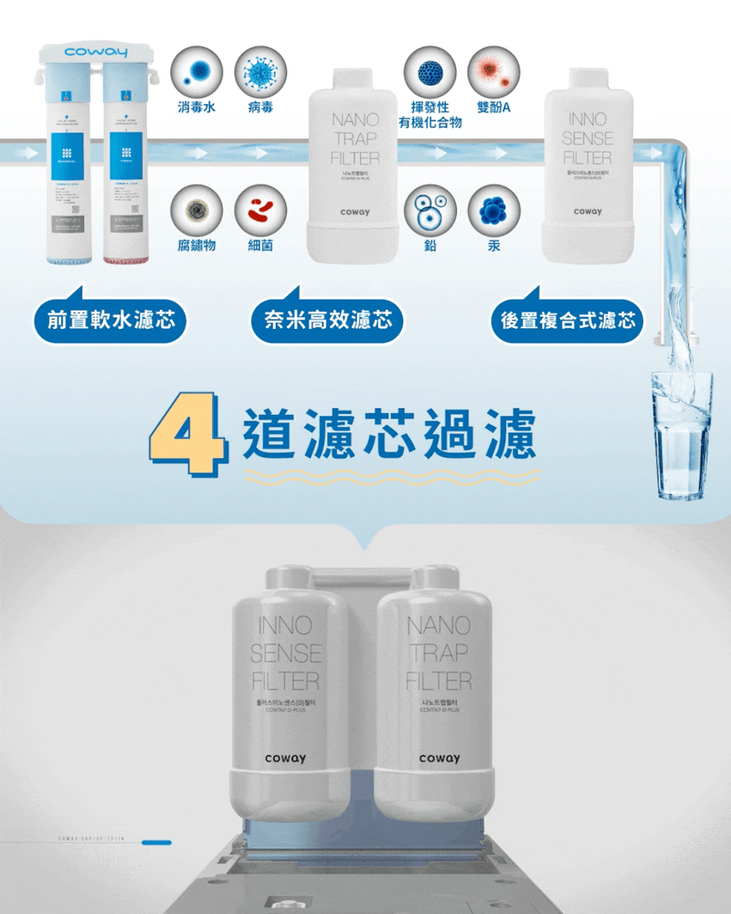 前置軟水兩階段過濾濾芯,能除去水中易造成水垢的物質,常保飲水機效能;獨家核心過濾技術「Nano-trap 奈米高校過濾濾芯」與「Inno-sense 後置複合式濾芯」,可以濾除水中 99.99% 的細菌、孢囊及病毒和環境賀爾蒙(雙酚 A 等)等 98 種有害物質,並通過台灣 SGS 檢驗,水質符合國家生飲標準,出水後不需煮沸也能安心直飲。