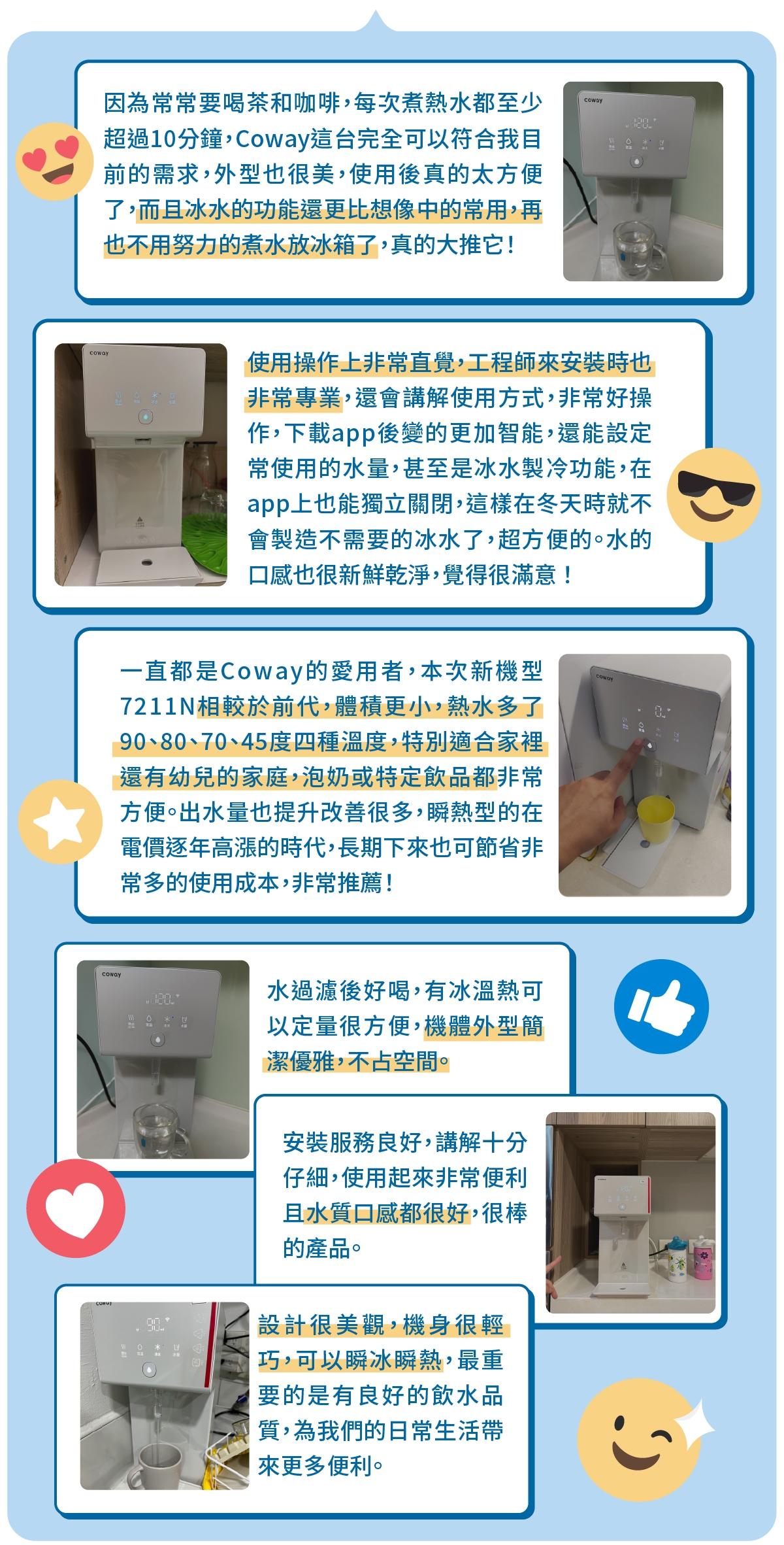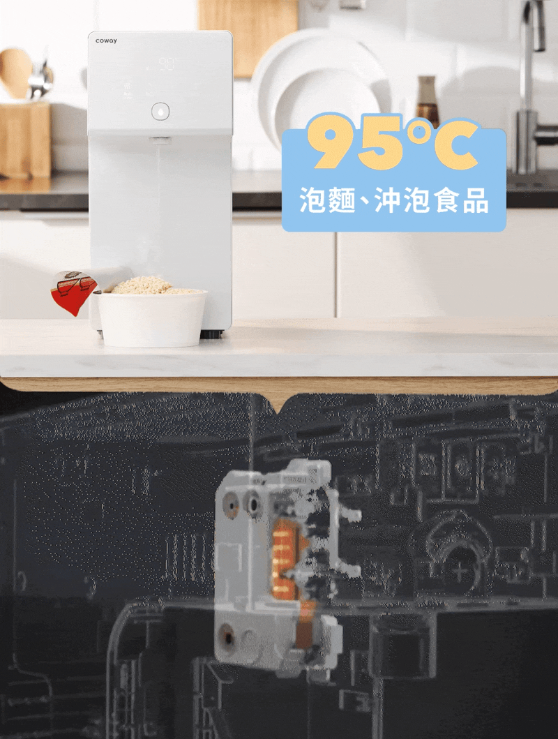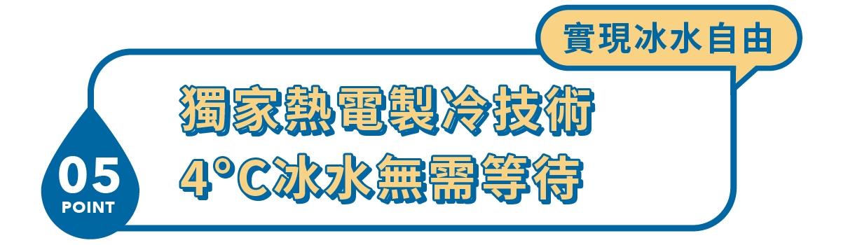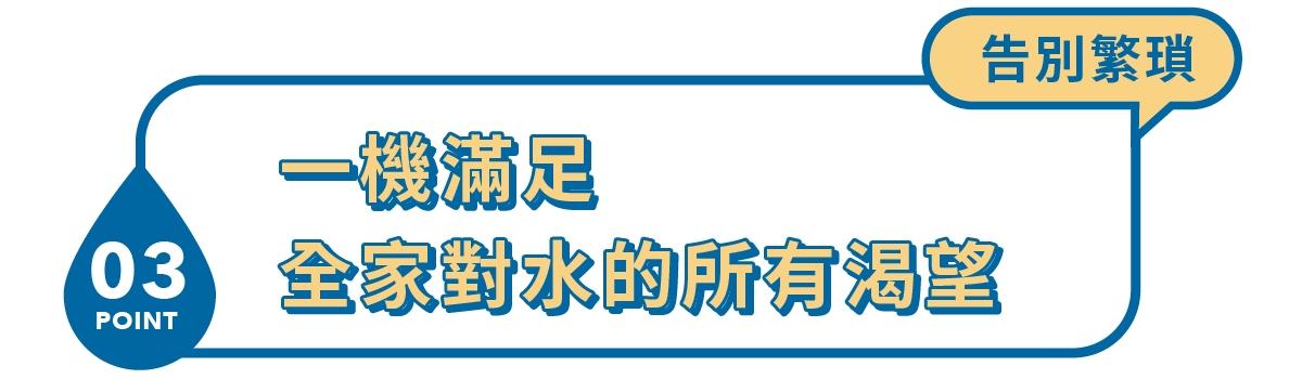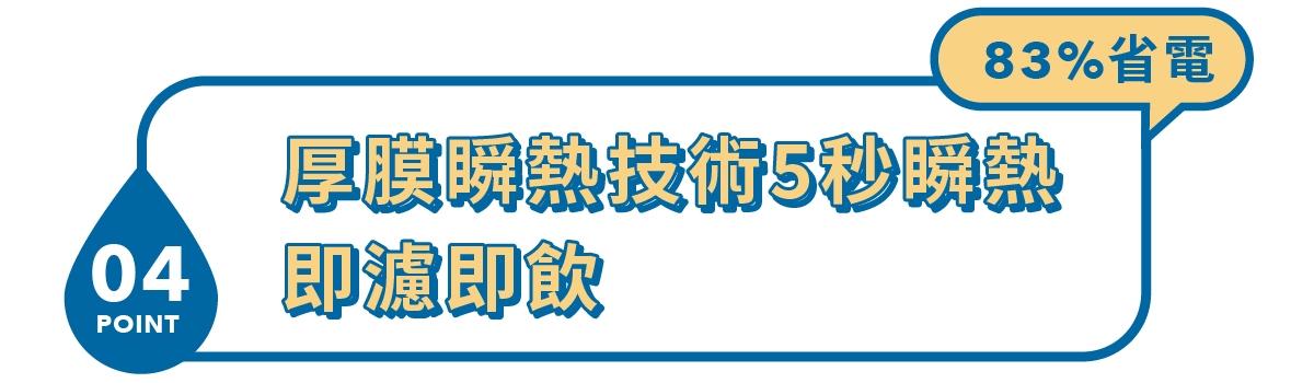內建有 90 °C、80 °C、70 °C、45 °C、常溫、冰水等 6 種溫度設定,可滿足冰水、熱水、茶、咖啡、泡奶等日常飲用水需求:而瞬熱技術可以省去傳統熱水槽、電熱水瓶等不必要的熱能消耗,告別千滾水即濾即飲,同時達到節能省電,一年電費約可省下 $3,850 元。