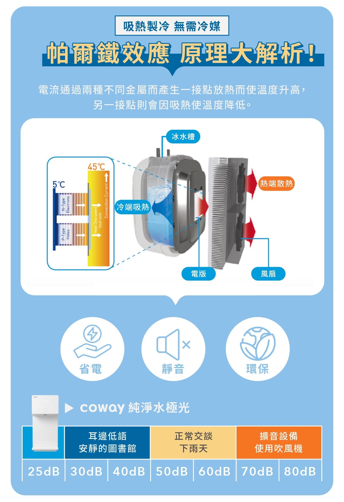 純淨水極光使用環保的電磁冷卻系統,利用帕爾鐵效應吸熱製冷,無需冷媒即可產生 4°C 冰水,同時還可免去壓縮機製造的噪音,比圖書館還安靜;搭配內建的 1L 儲水空間,輕鬆實現冰水飲用自由!