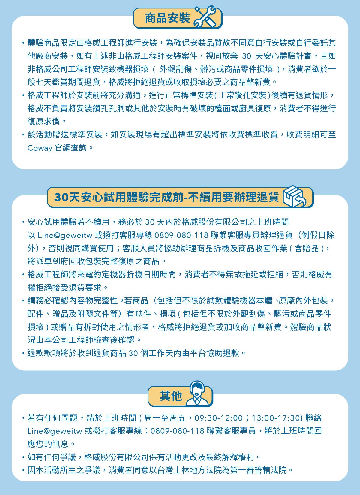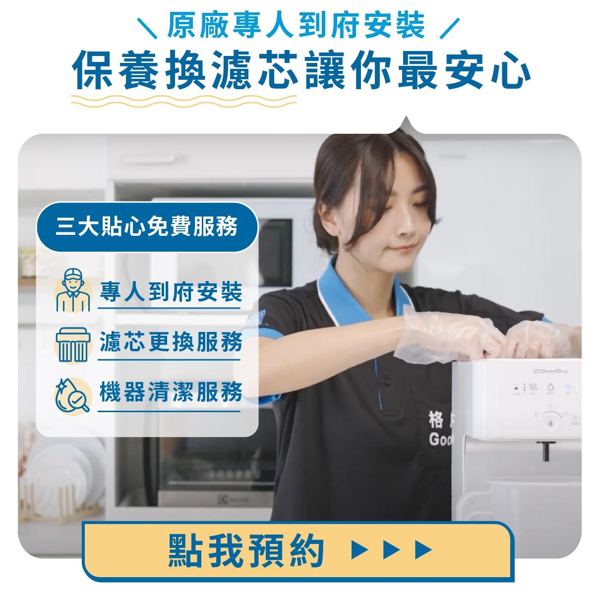 台灣本島全區皆有專業工程師免費到府安裝服務;臨界濾芯更換週期,服務人員主動提醒,購買 Coway 原廠濾芯組,即有專人到府提供濾芯更換/機器保養,享受貼心售後服務!